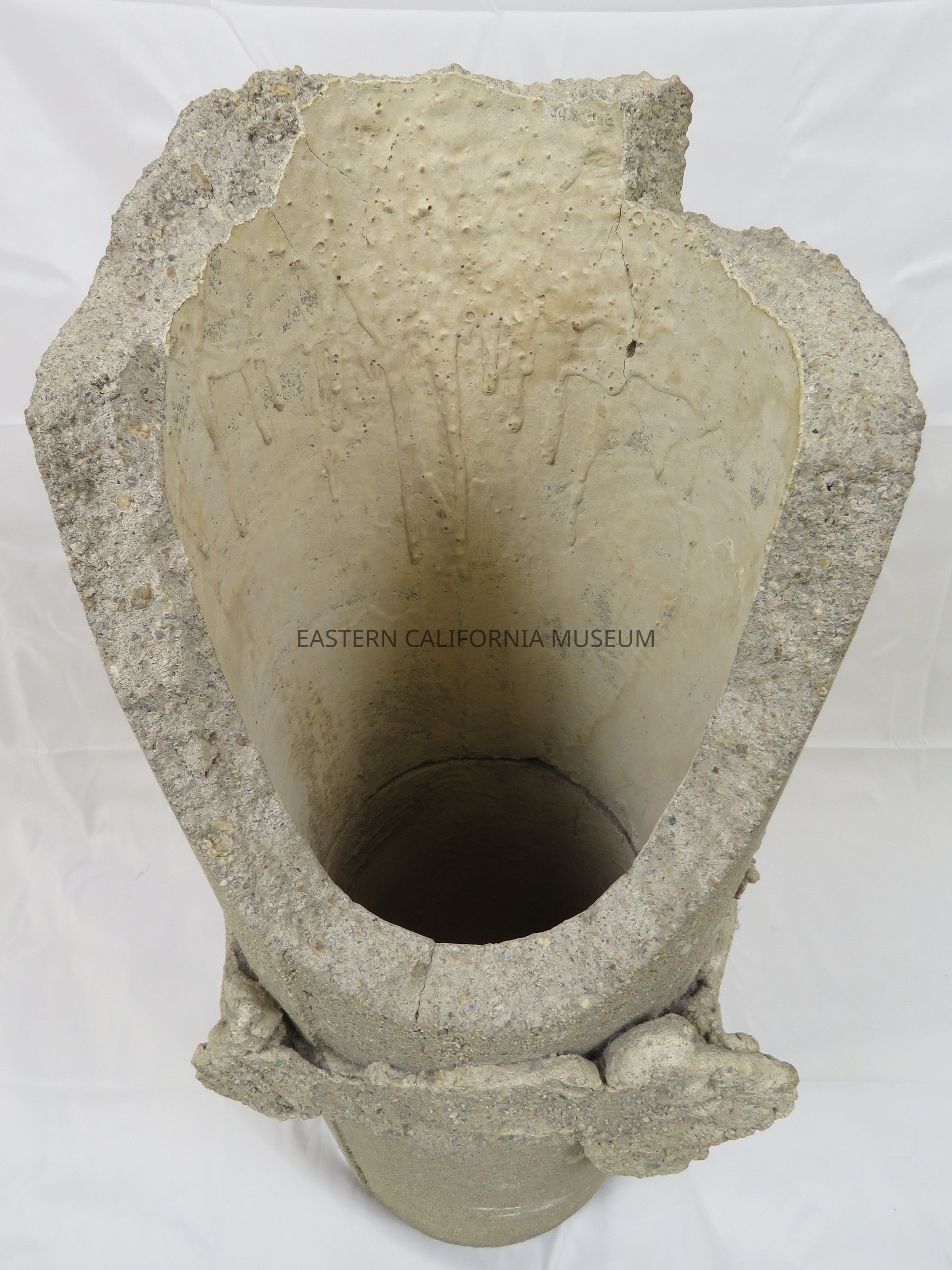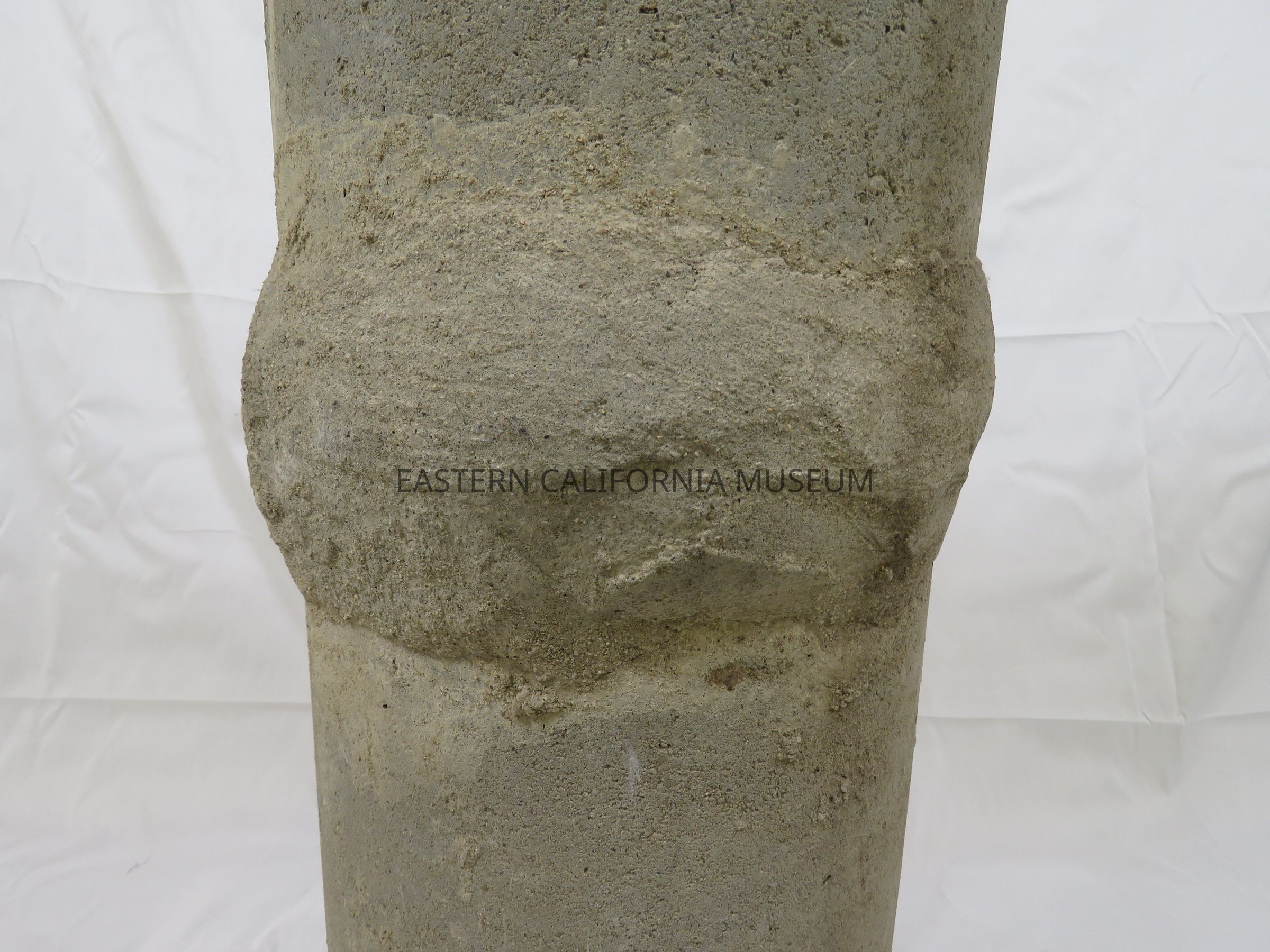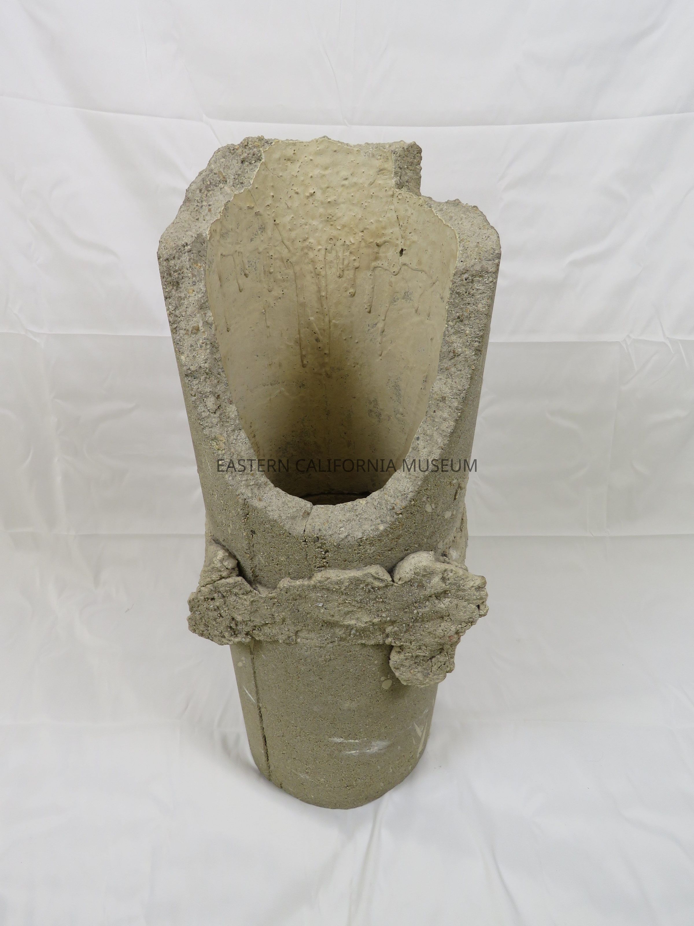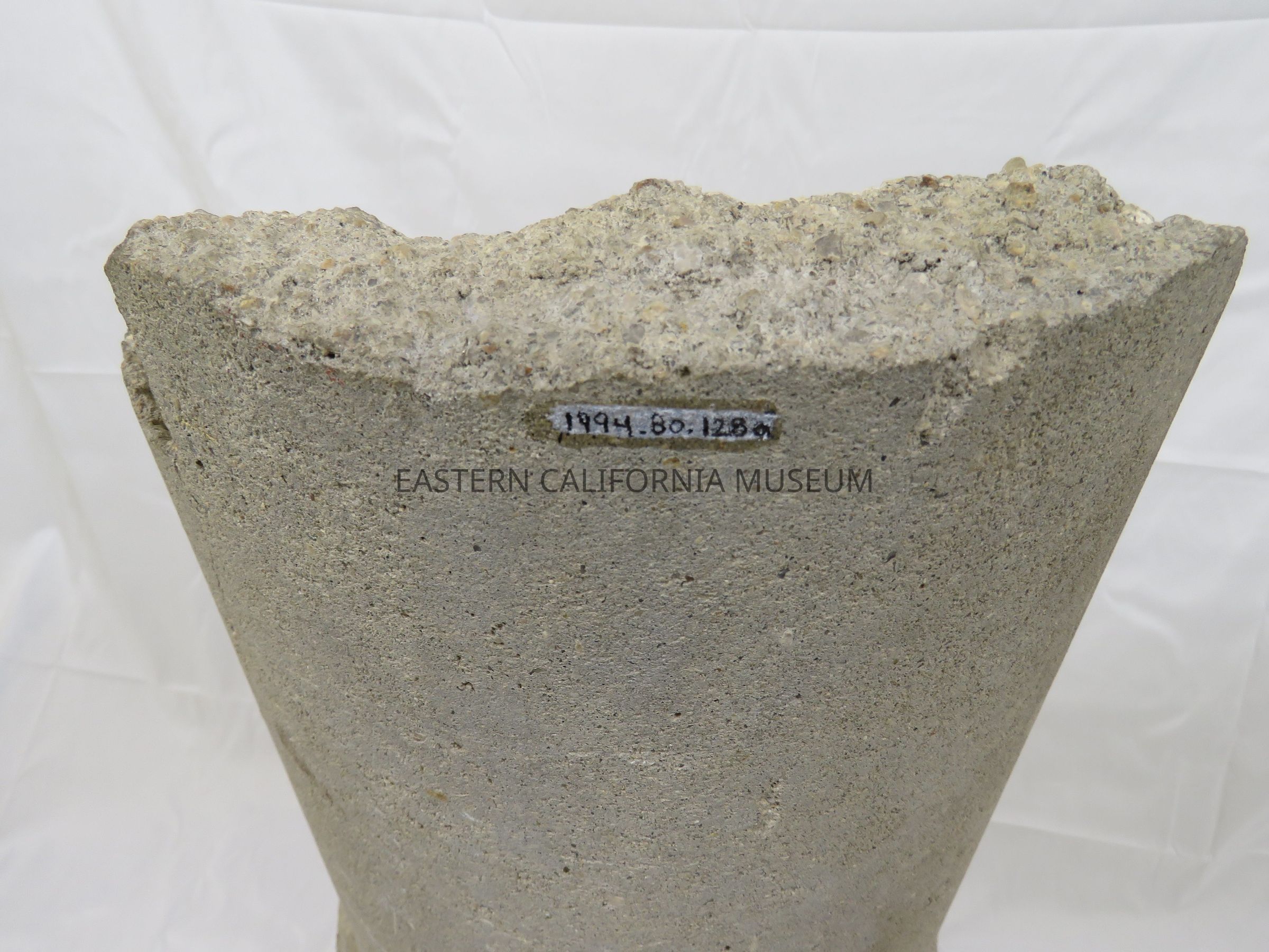 Section of concrete pipe from the "orchard community" town of Manzanar (pre-WWII) constructed by Van Lutzow circa 1910. The pipe was made in a cylindrical mold with added concrete at each seam when laid in ground. It was found east from the dam at Manzanar.Collection