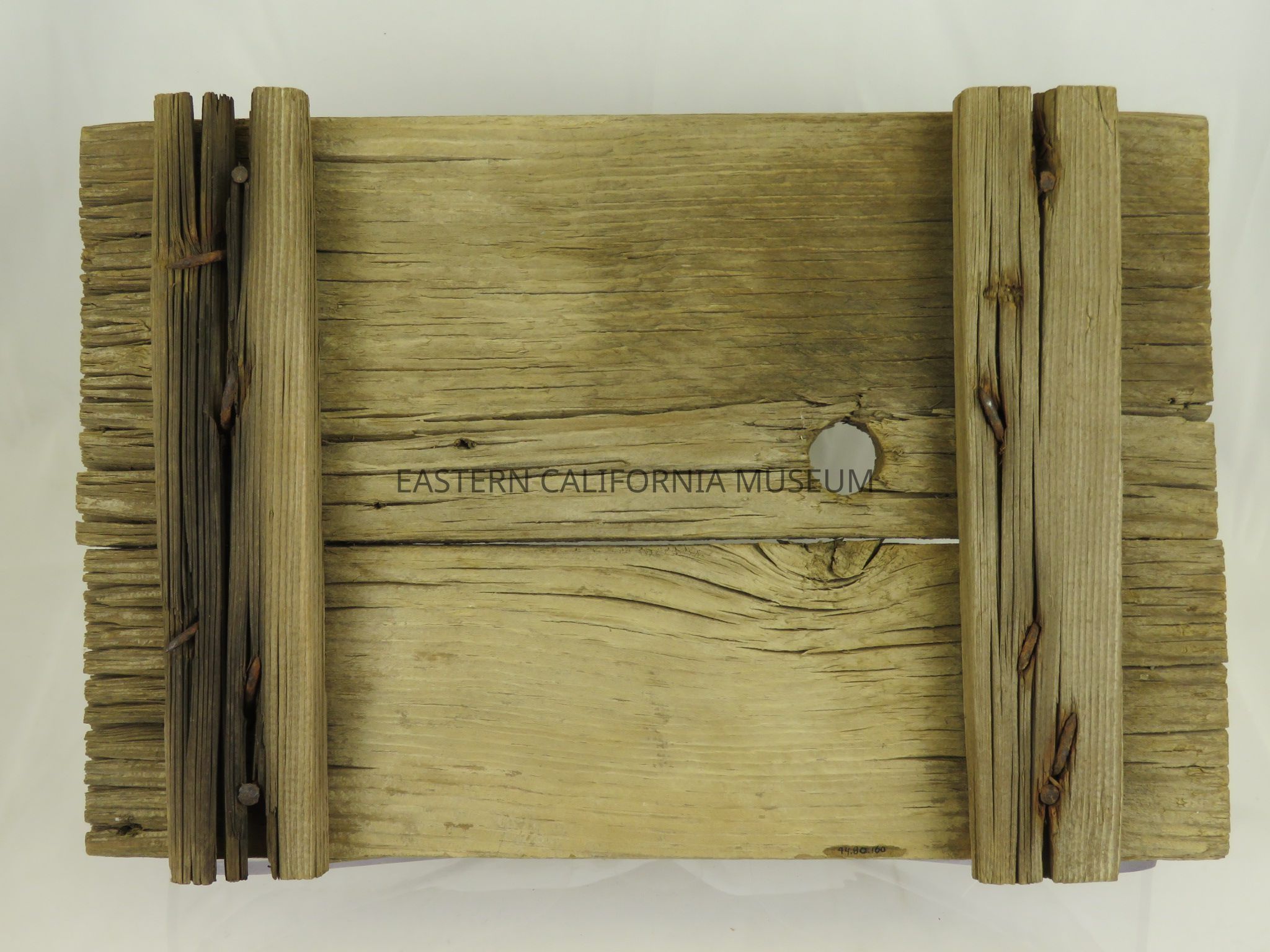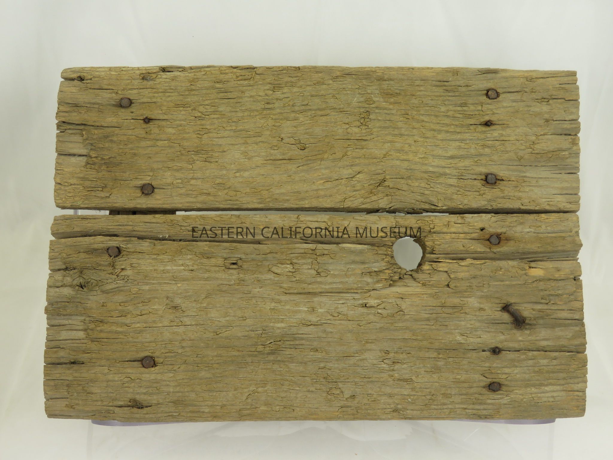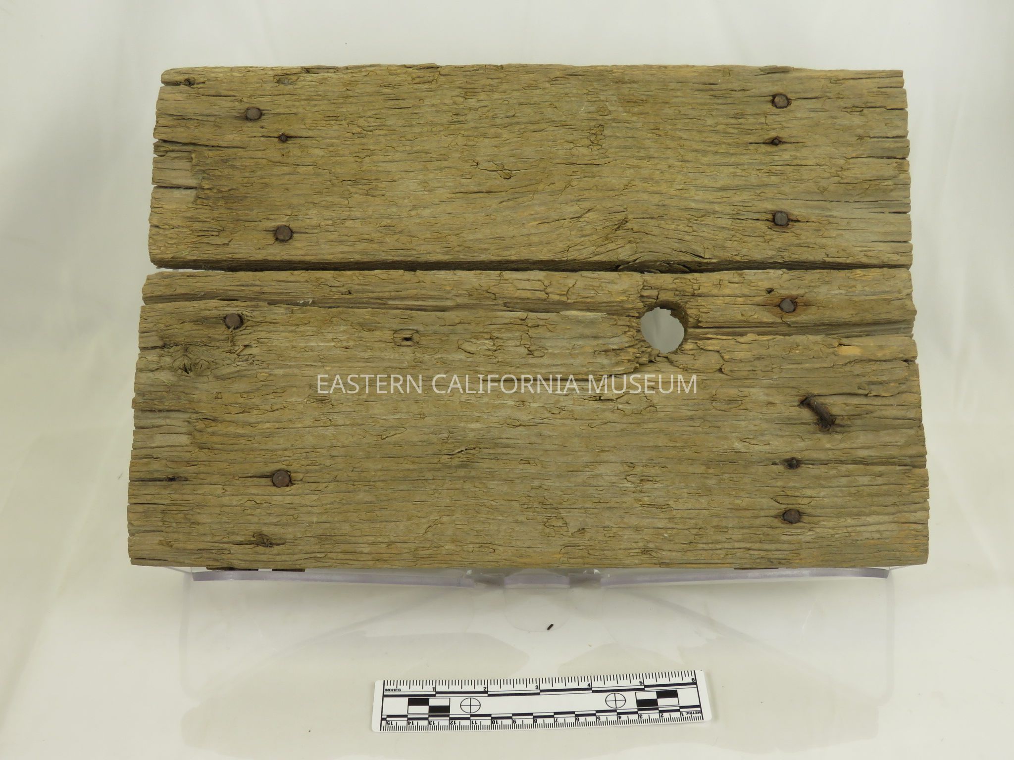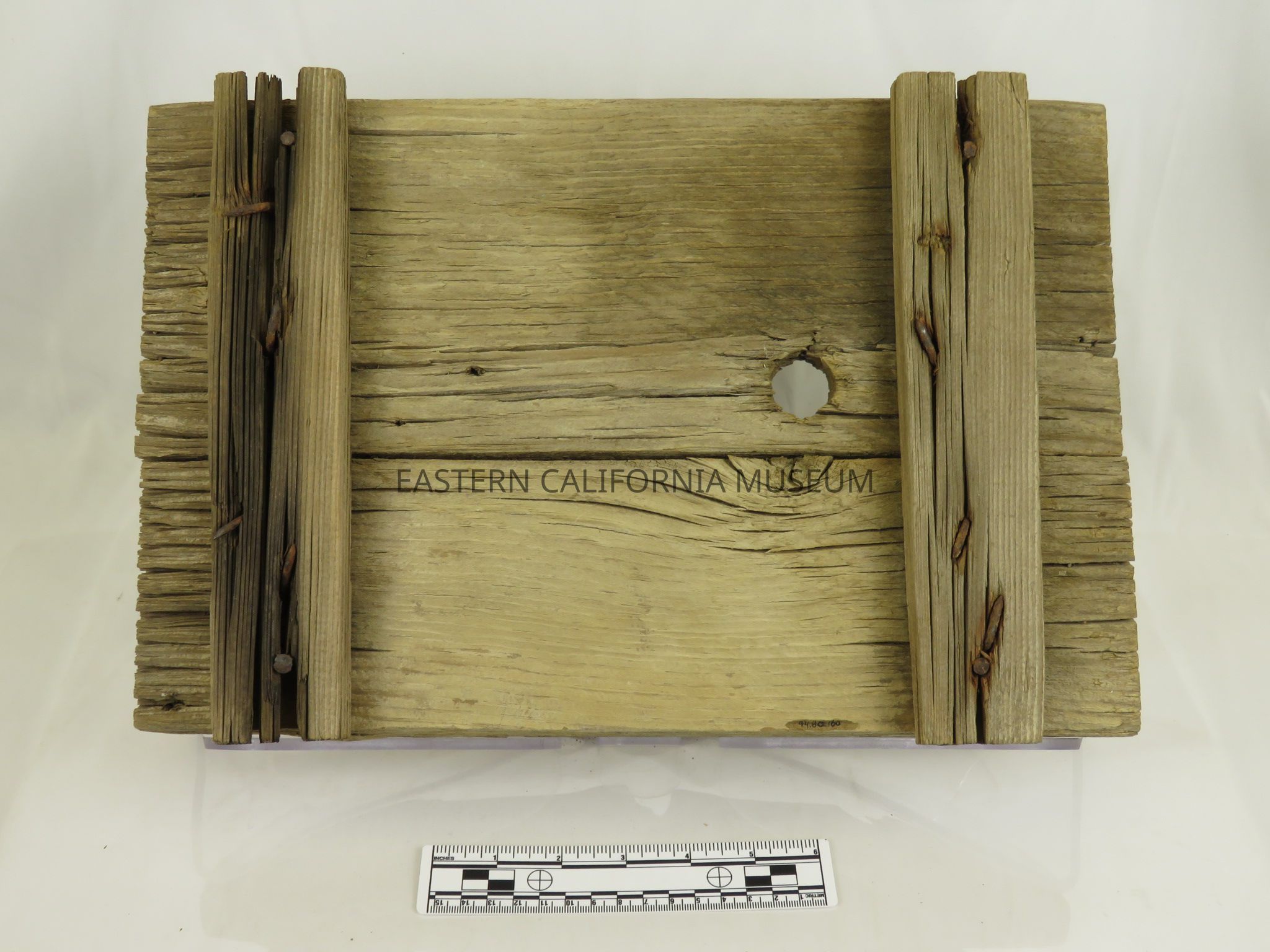 Wooden pitcher's plate from Manzanar War Relocation Center. It was found in 1985 by Hank Umemoto in its original location (between the 19 block and 25 block firebreak) after 43 years.Collection