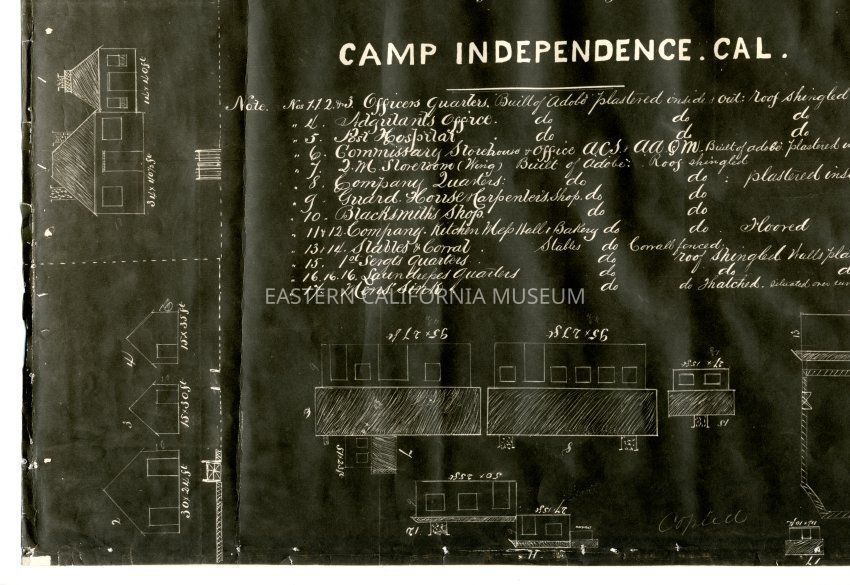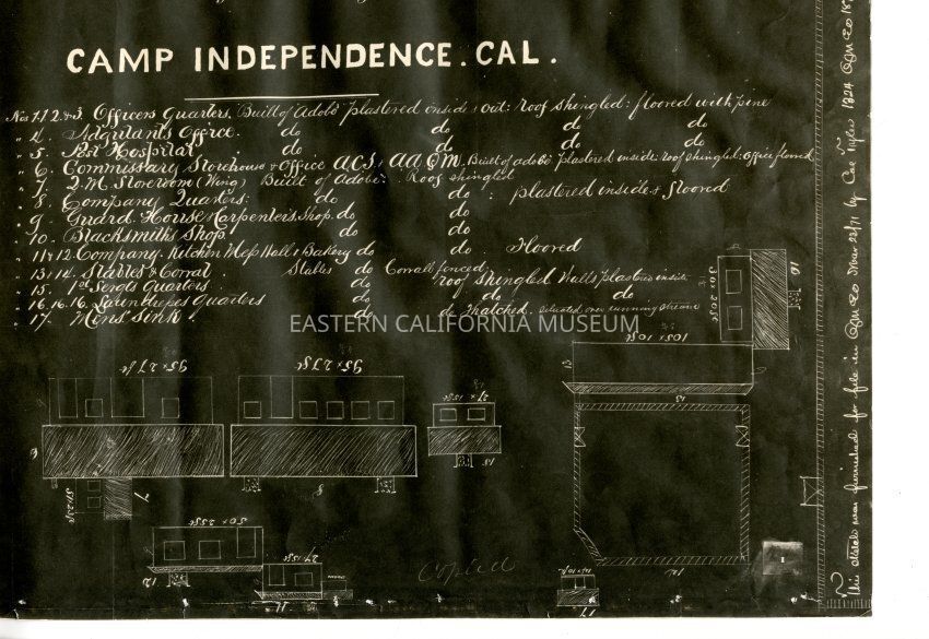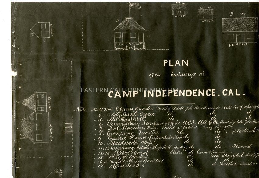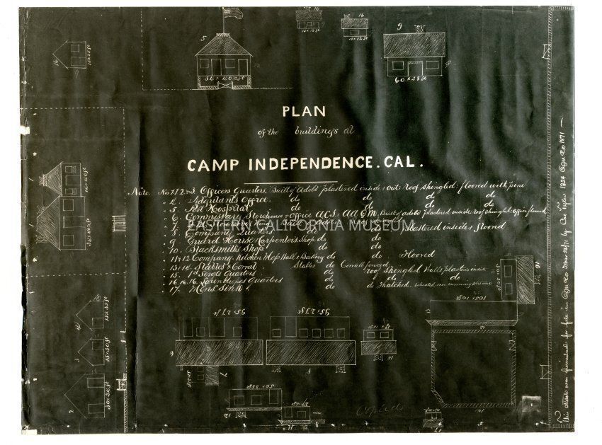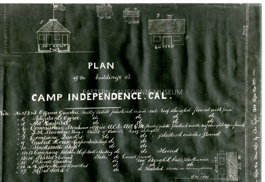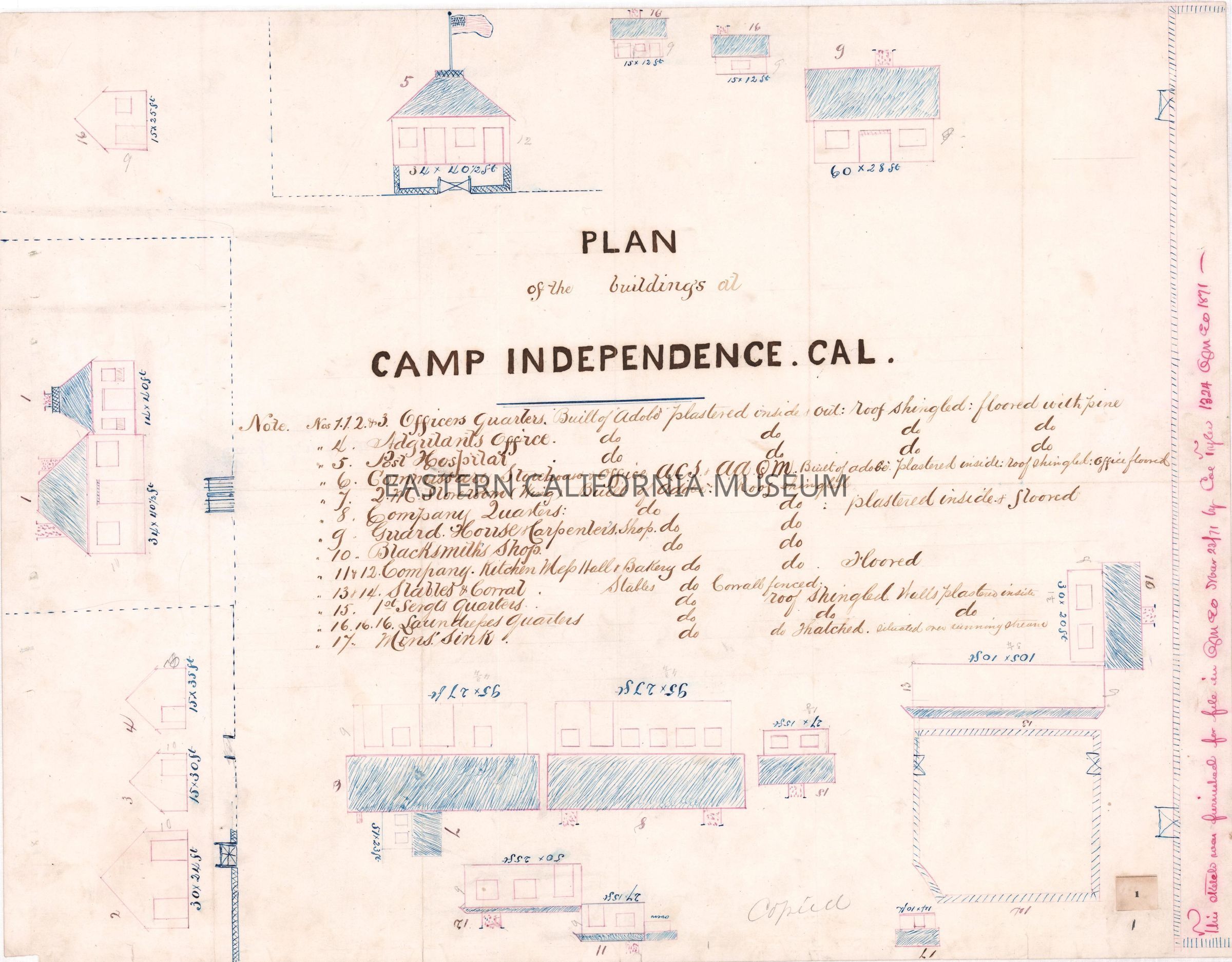 Copy (and enlargement?) of a diagram titled, "Plan of the buildings at Camp Independence, Cal." It lists 17 buildings. It was made in 1871 and shows the buildings were constructed from adobe.Provenance