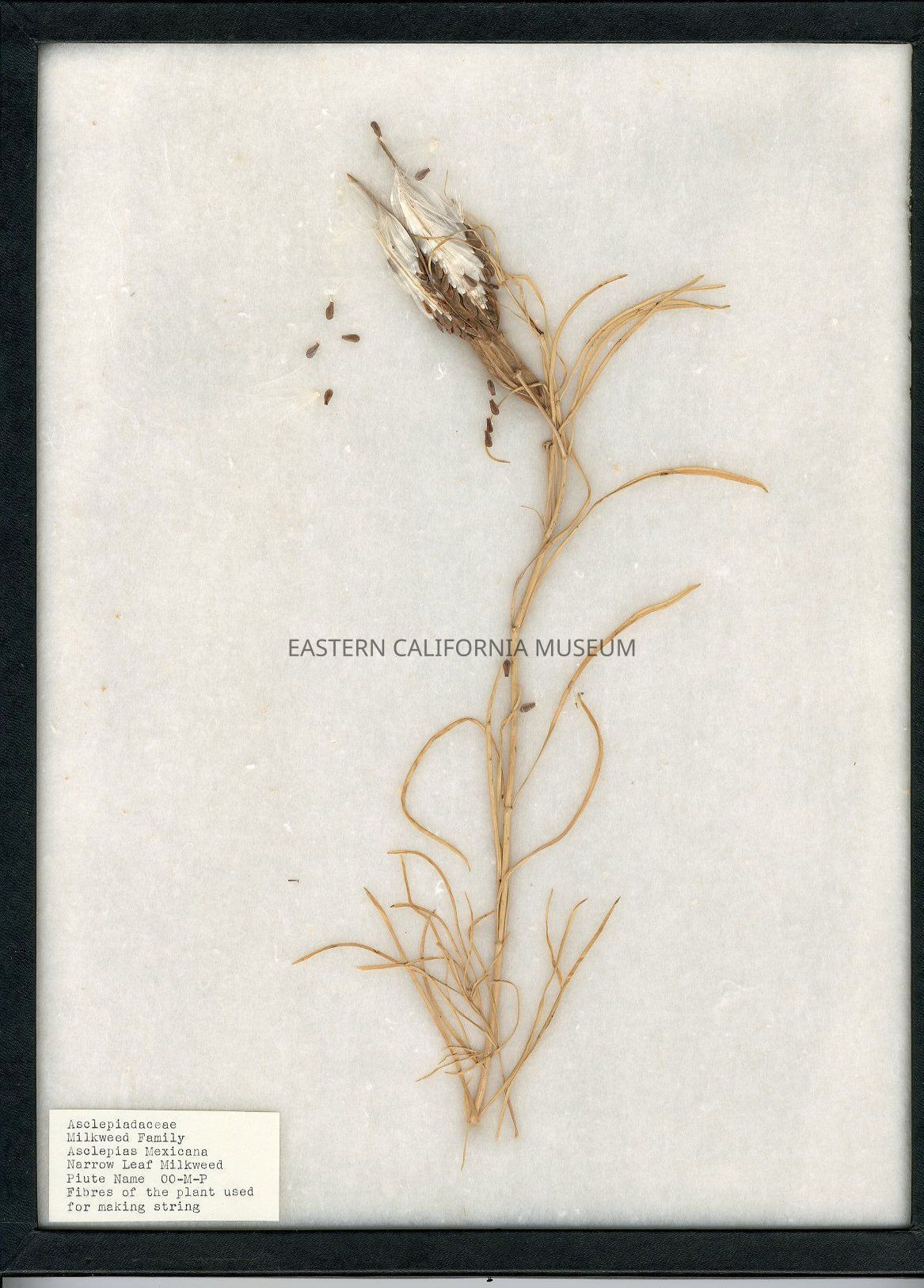 Asclepiadaceae Milkweed Family Asclepias mexicana Narrow Leaf Milkweed Piute [Paiute] name: OO-M-P Fibers of the plant used for making string On reverse: Riker Specimen Mount label