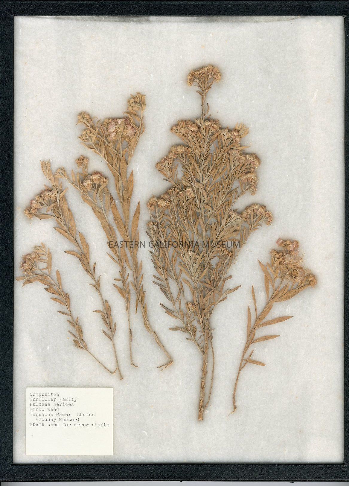 Compositae Sunflower Family Pulchea sericea Arrow Weed Shoshone Name: Chavoe (Johnny Hunter) Stems used for arrow shafts On reverse: Riker Specimen Mount label