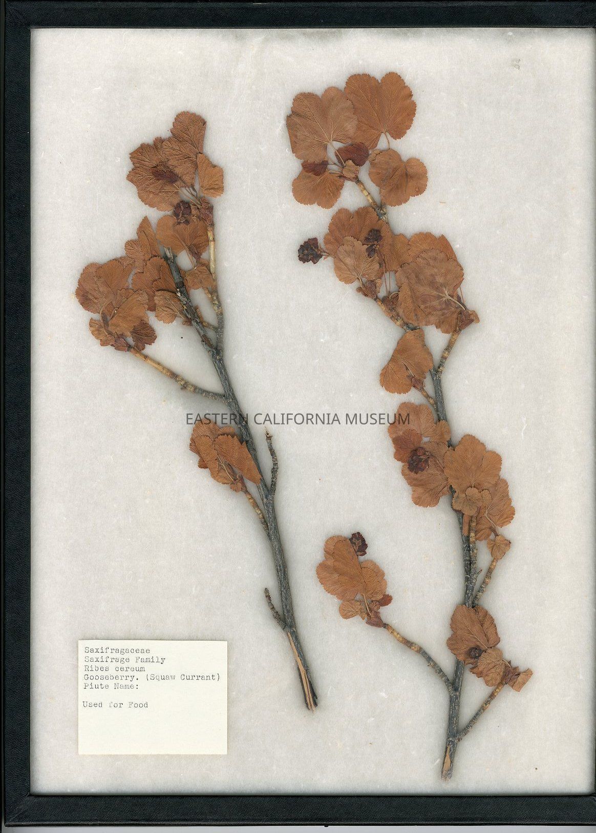 Saxifragaceae Saxifrage Family Ribes cereum Gooseberry (Squaw Currant) Piute [Paiute] name: [blank] Used for food On reverse: Riker Specimen Mount label