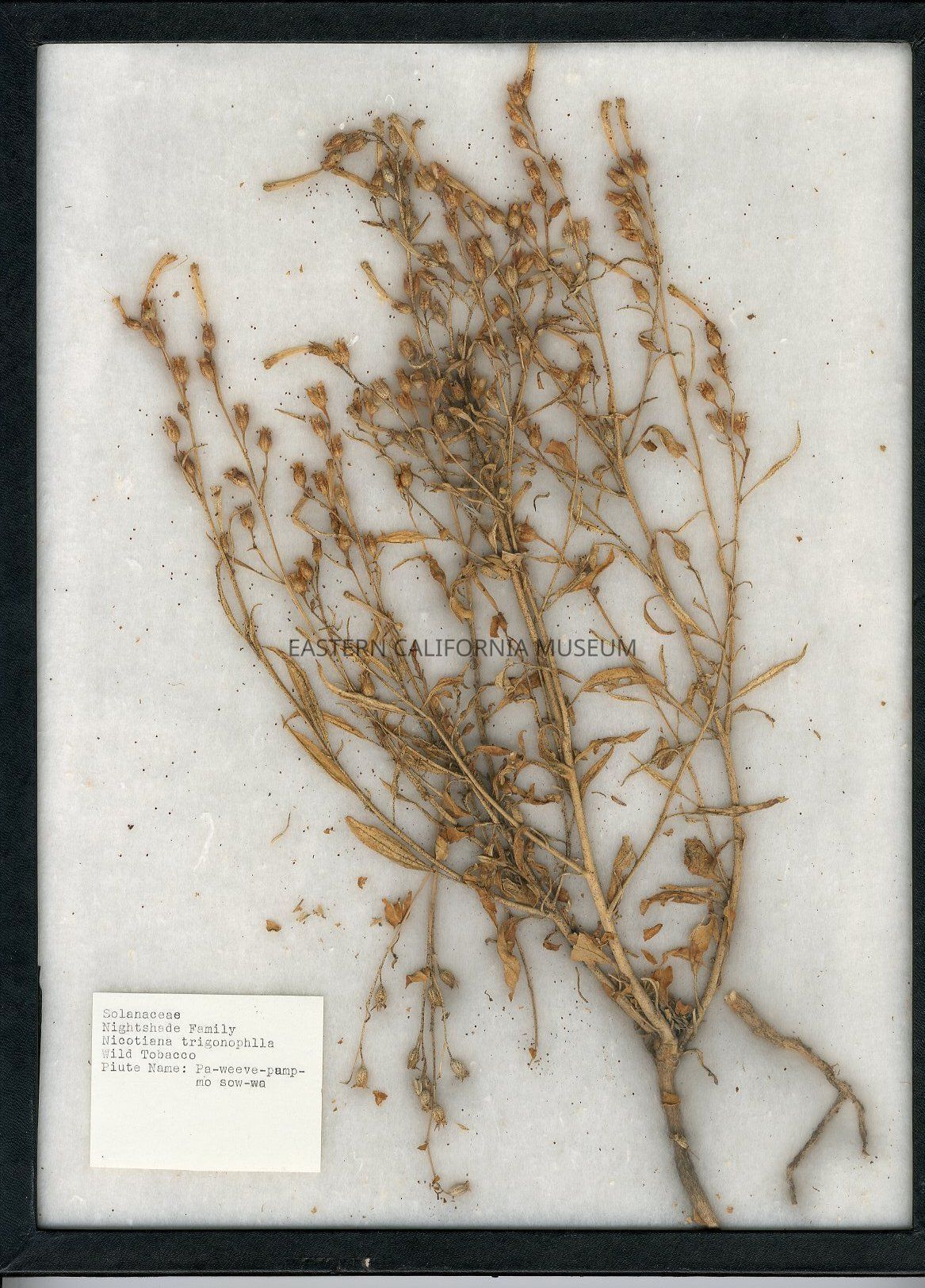 Solanaceae Nightshade Family Nicotiana trigonophlla Wild Tobacco Piute [Paiute] name: Pa-weeve-pamp-mo sow-wa On reverse: Riker Specimen Mount label