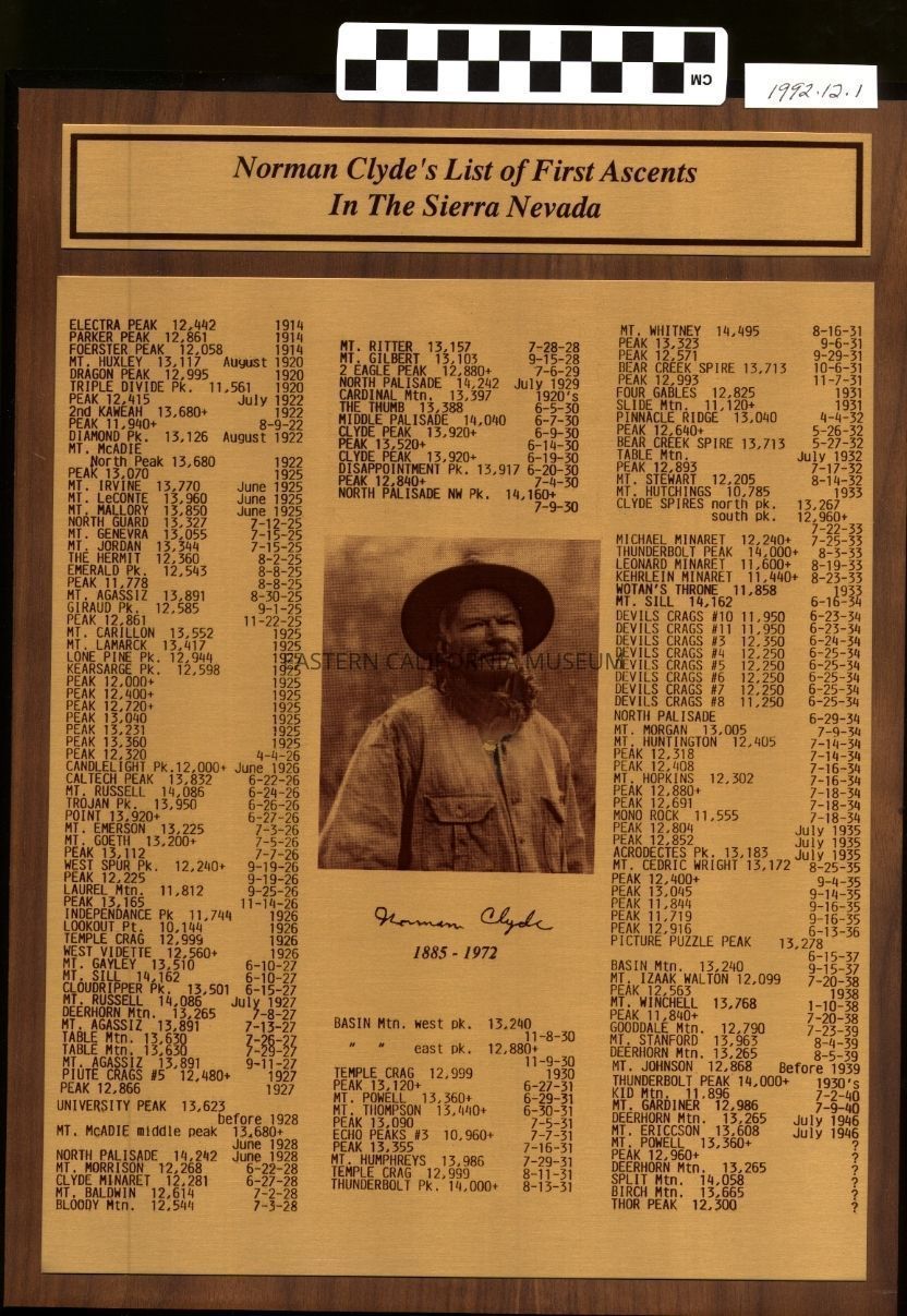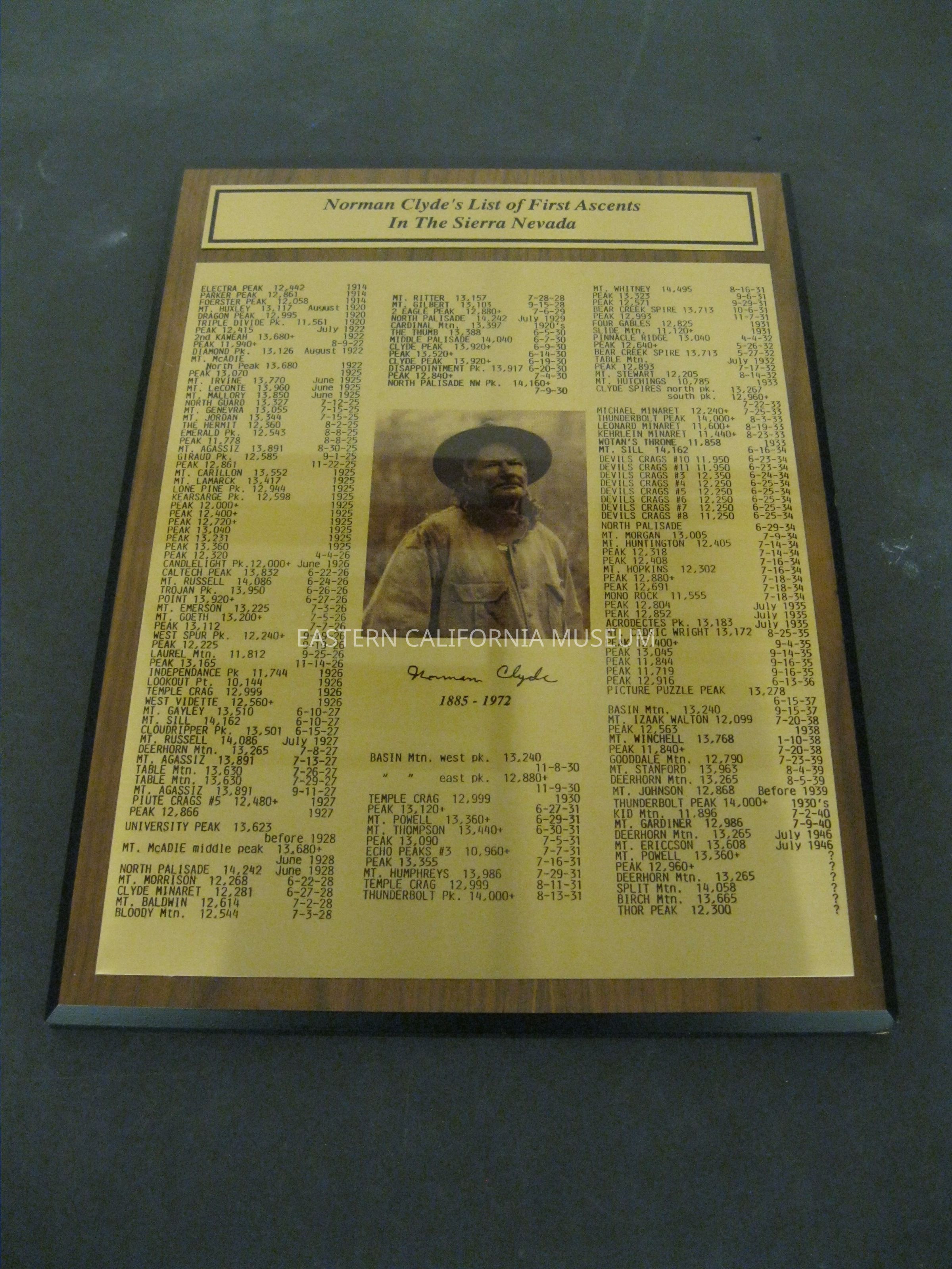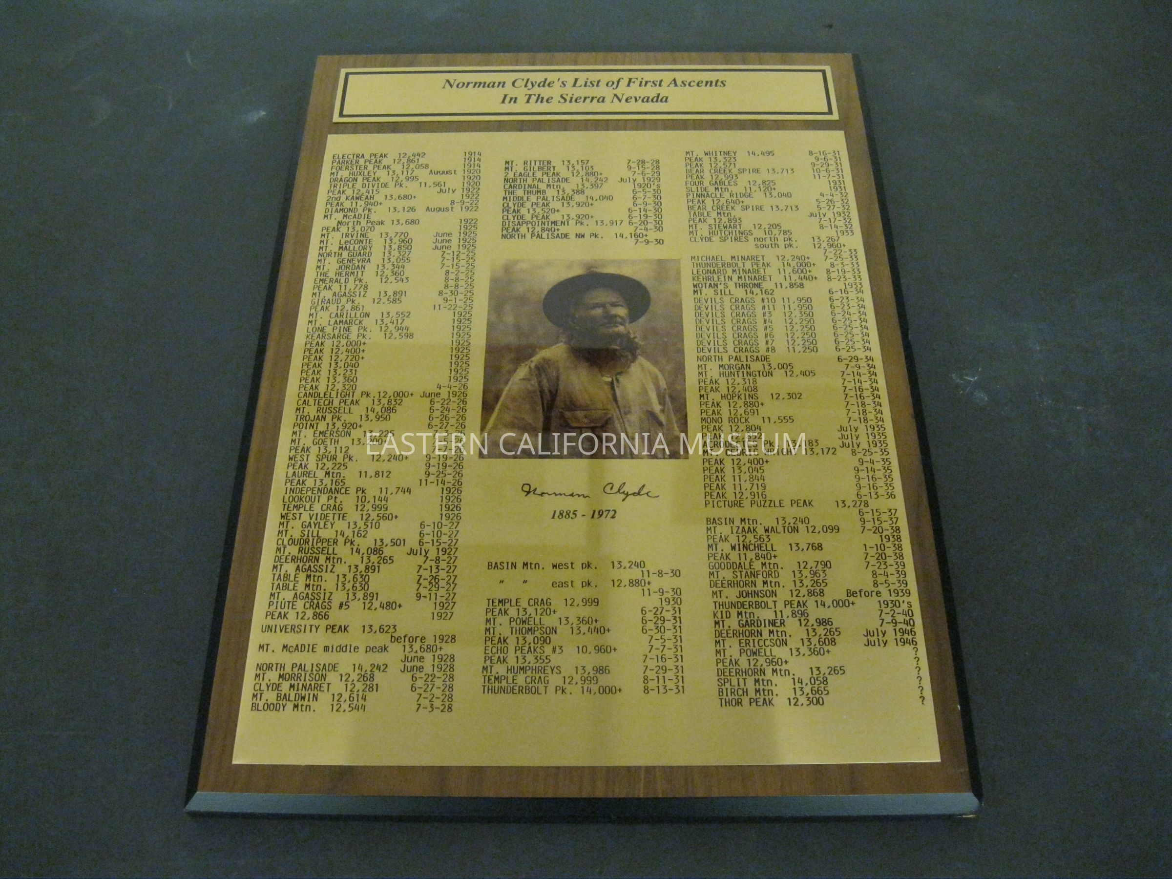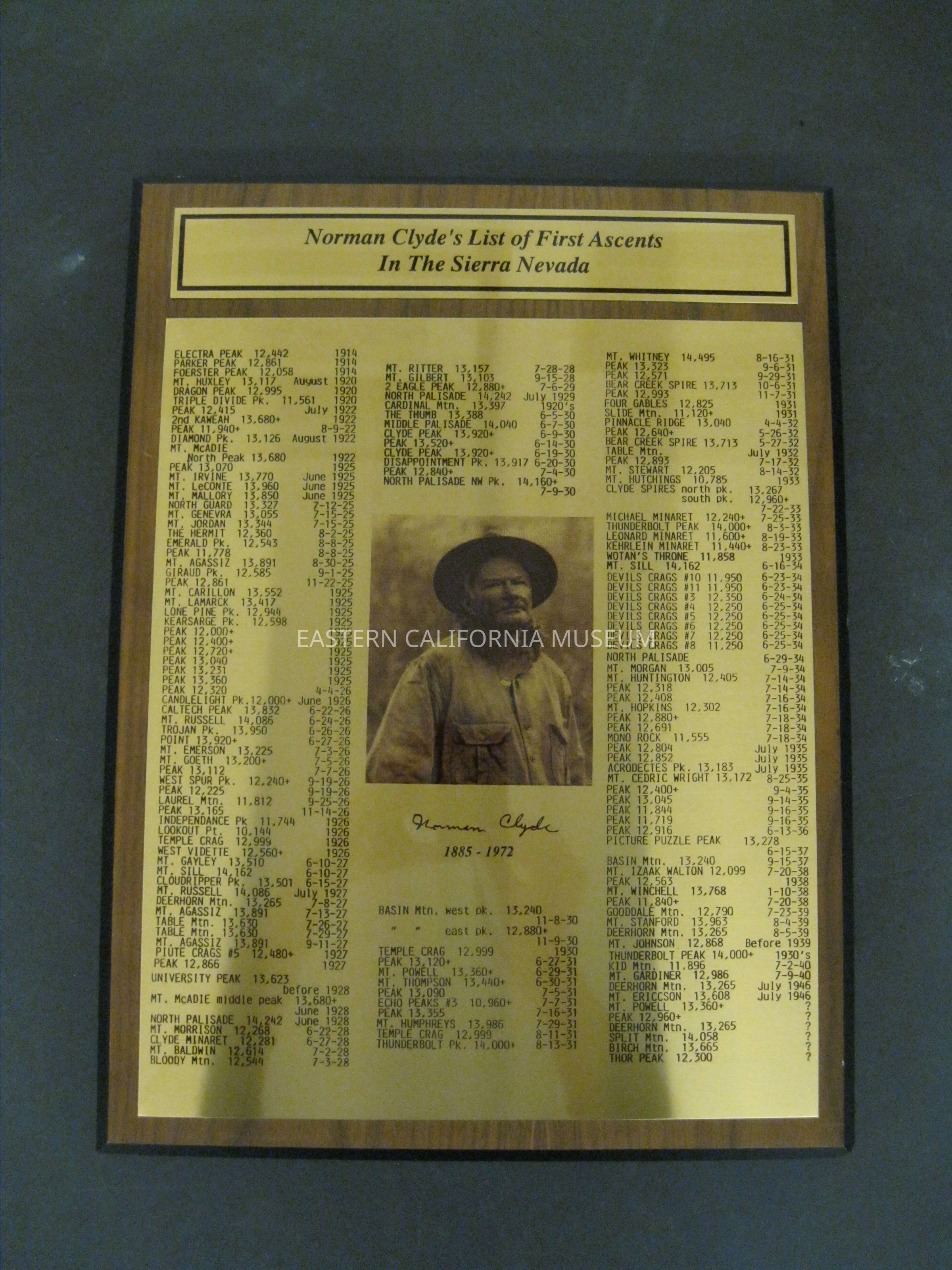 Plaque titled "Norman Clyde's List of First Ascents in the Sierra Nevada." It includes a photo of Clyde and a facsimile of his signature. It is composed of two brass plates on wood backing with black sides, and is beveled along upper edges on all four sides. The bottom right corner is slightly damaged.