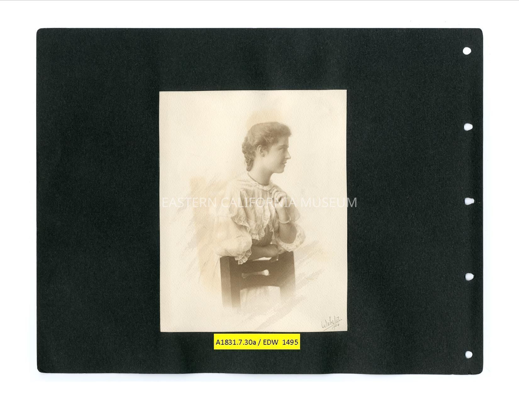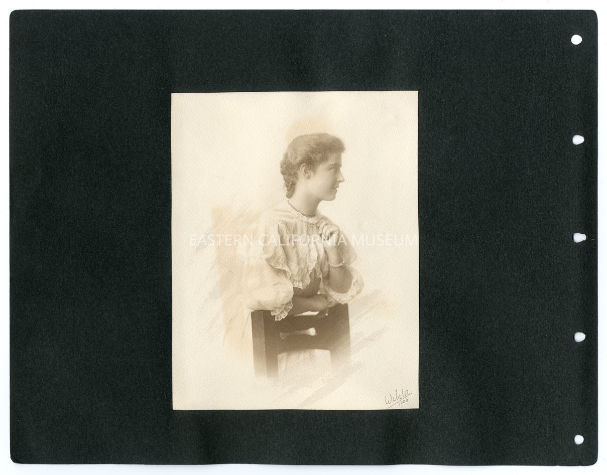 A1831.7.30a: Photo of Helen Gunn posing in profile with a chair. It is signed and dated "Webster 1906" in the lower right corner. Possibly a platinotype.Photograph Details