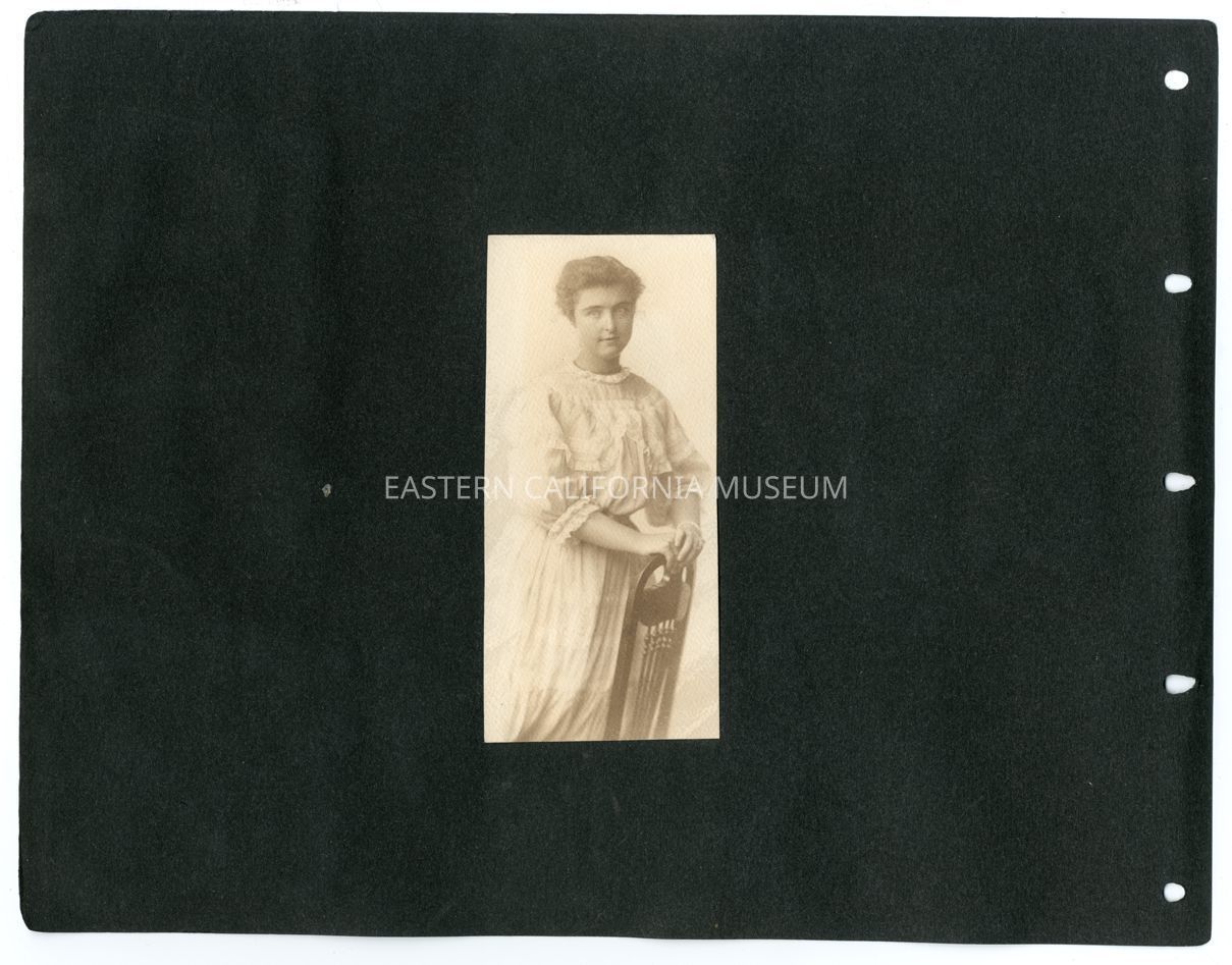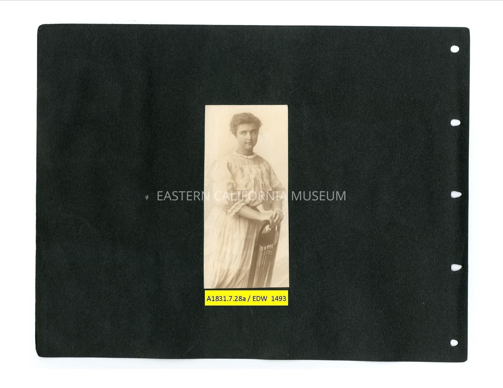 A1831.7.28a: Photo of Helen Gunn posing with a chair. Possibly a platinotype.