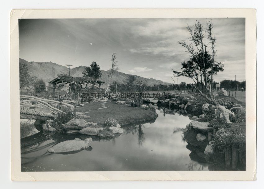 Exterior photograph of Merritt Park, showing pond, bridge, and gazebo. Ansel Adams' title for this photo is, "Pool in pleasure park, Manzanar Relocation Center, Calif."