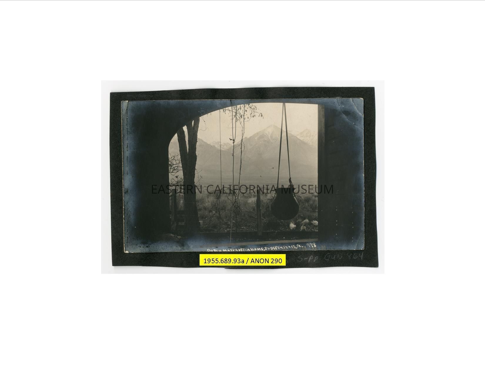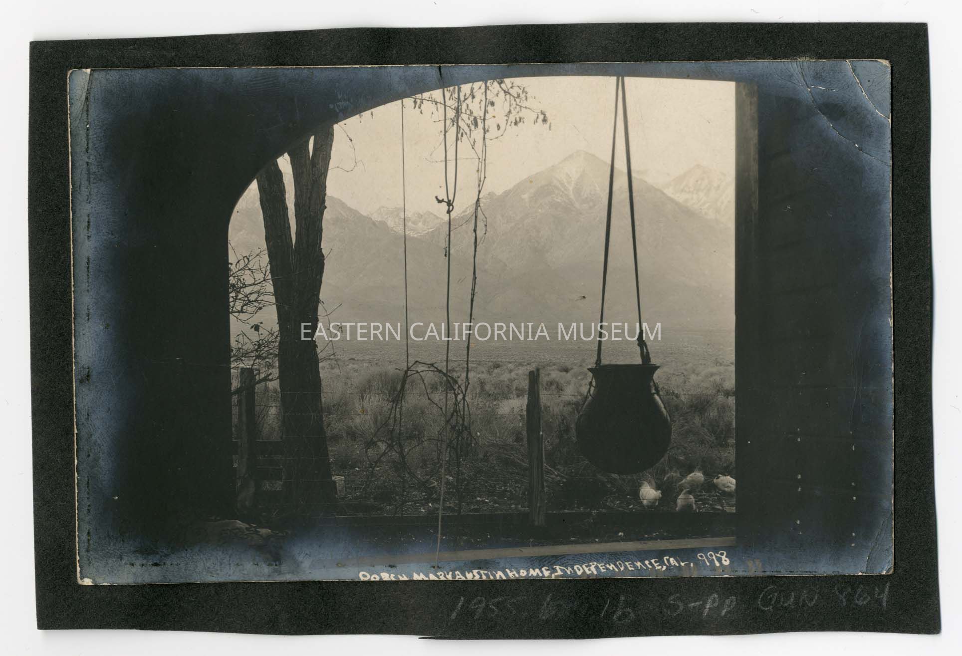 Photograph taken from the porch of the Mary Austin house in Independence looking west towards the Sierra Nevada mountain range. There is a pot hanging form the arched opening. The photographer has numbered this photo "998."