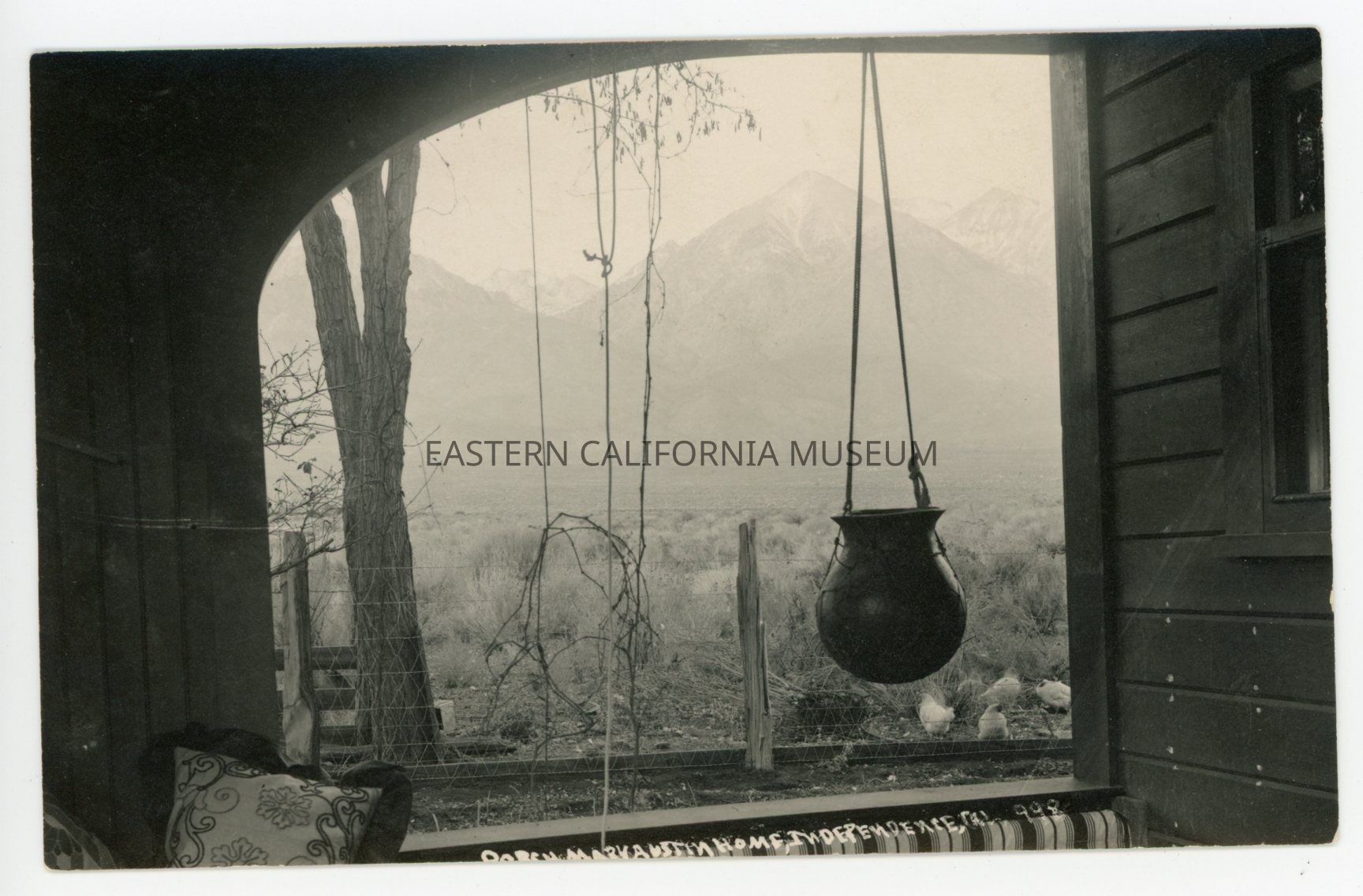 Photo postcard taken from the porch of the Mary Austin house in Independence looking west towards the Sierra Nevada mountain range. There is a pot hanging form the arched opening. The photographer has numbered this photo "998."