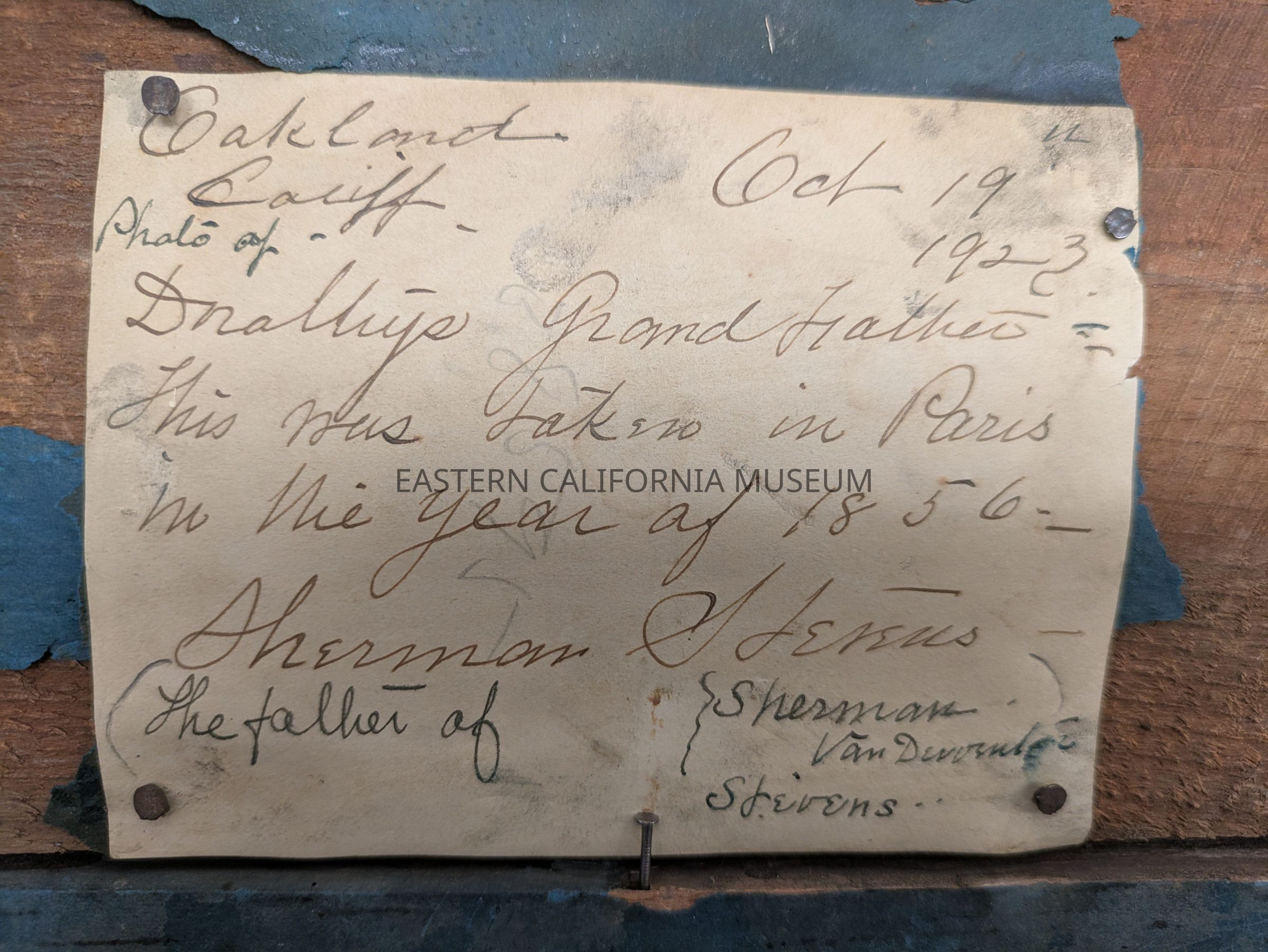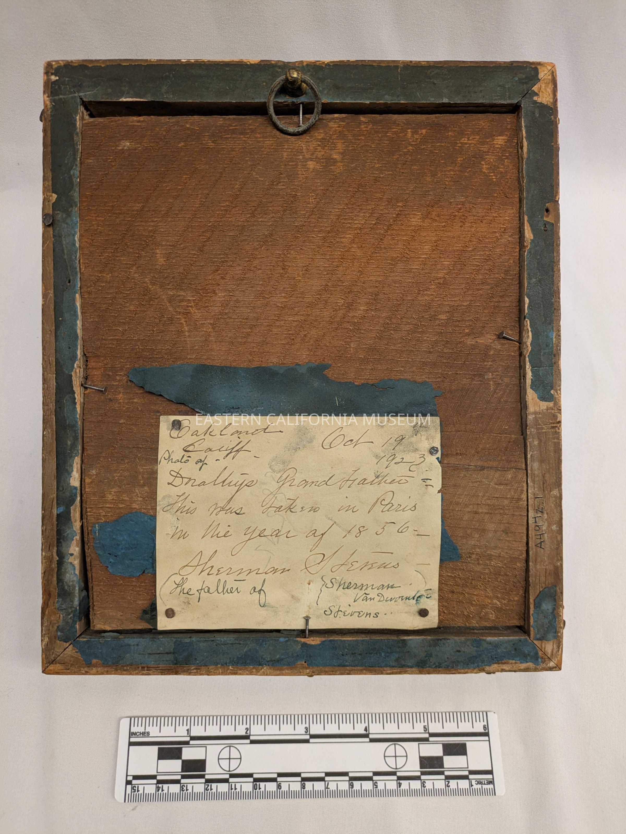 Handwritten note nailed to back says: Oakland, Calif. Oct. 19, 1923. Photo of Dorothy's grandfather. This was taken in Paris in the year of 1856. Sherman Stevens. The father of Sherman Van Deventer Stevens.