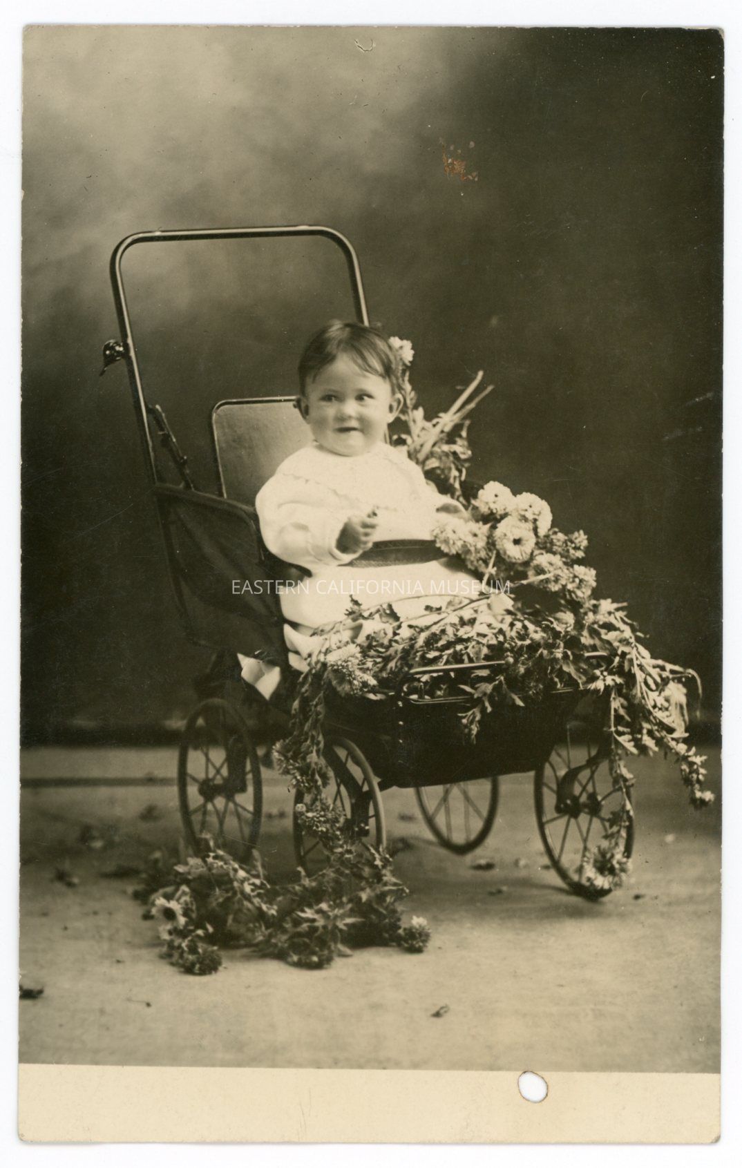 Photo postcard taken in a studio of a baby sitting up in a baby carriage with lots of flowers.Collection