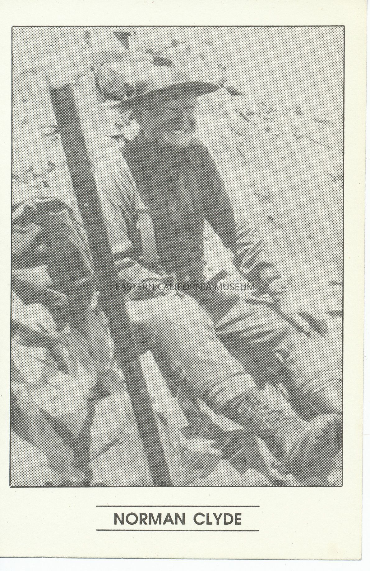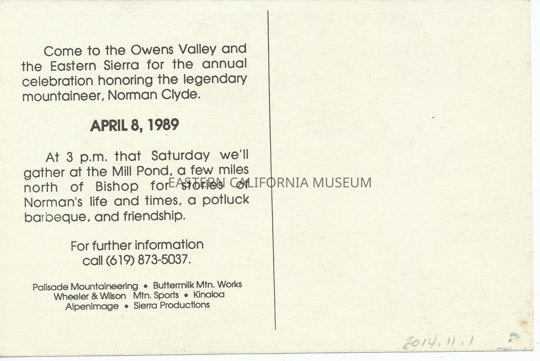 Postcard notice for "the annual celebration honoring the legendary mountaineer, Norman Clyde" on April 8, 1989 at Mill Pond.