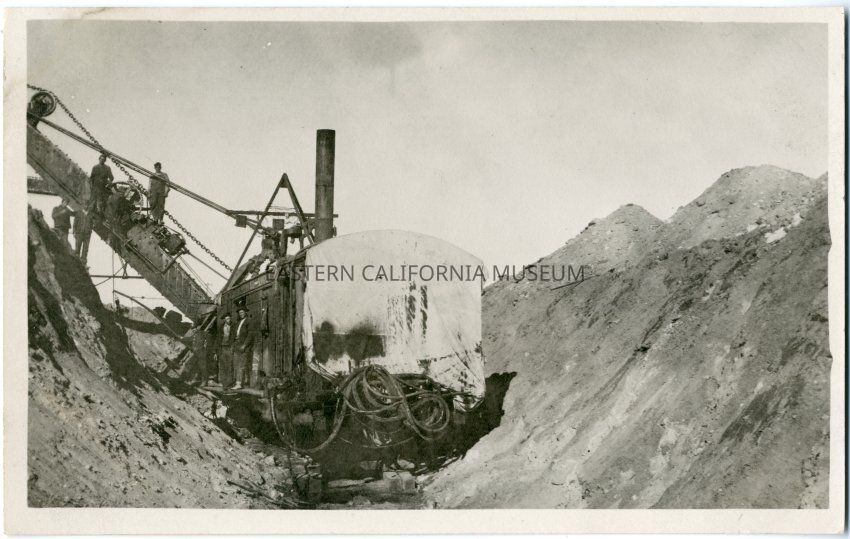 Photo postcard showing a Marion 60 steam shovel crew taking a break from their work excavating a ditch for an open, lined section of Los Angeles Aqueduct. The location is in the Olancha Division, which covered the area from Alabama Gates to Haiwee Reservoir.