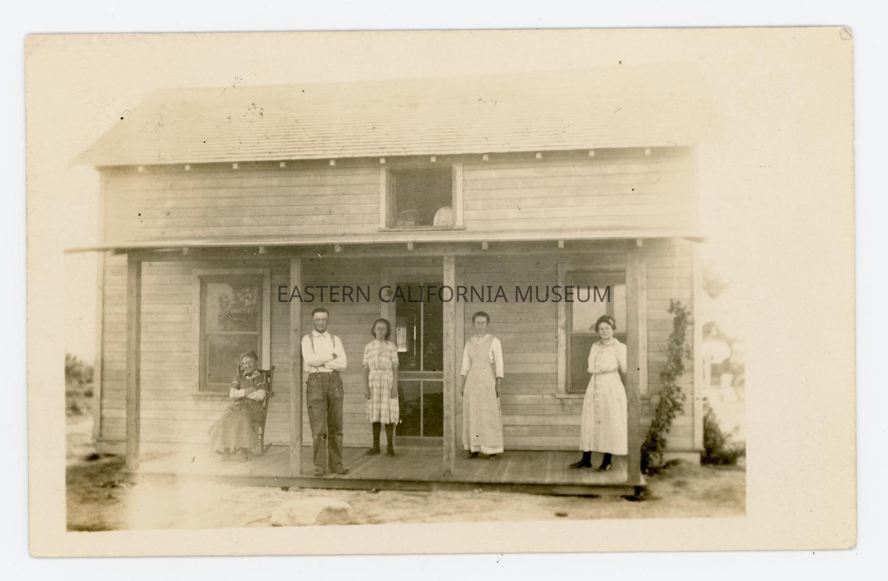 Photo postcard showing five people standing on the front porch of a house (not quite two stories, maybe a loft above?). It was sent from North Yakima, Washington on October 31, 1913 from Orvill to Joe Newby in Independence. It has a green one cent Washington stamp and two cancellation stamps: one in North Yakima on Oct. 31 and one in Independence on November 4, 1913.