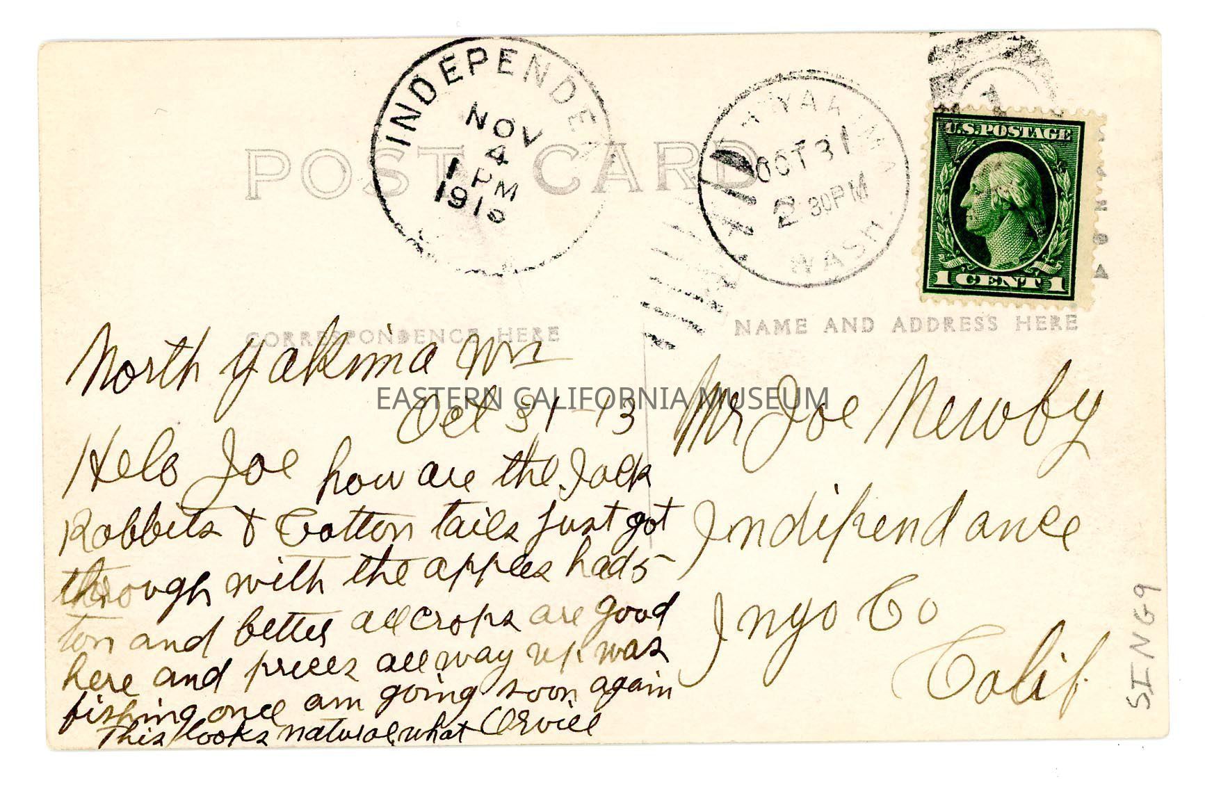 "North Yakima, WA, Oct. 31, '13. Helo [hello] Joe how are the jackrabbits and cottontails. Just got through with the apples. Had 5 ton and better. All crops are good here and prices all way up. Was fishing once am going soon again. This looks natural what. Orvill."Photograph Details