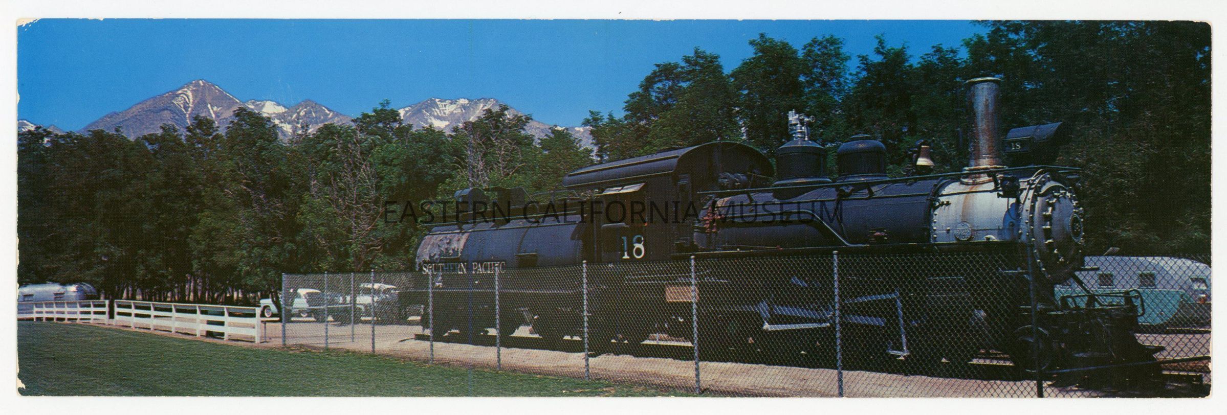 Publisher's blurb on reverse: Old Number 18, Narrow Gauge Railroad Engine, built by Baldwin in 1911, steamed joyously though the Owens River Valley for many years, its whistle reverberating from the Inyos to the Sierra Nevada Mountains. Number 18 now belongs to the Easttern California Museum Association, Independence, a gift of the Southern Pacific Railroad.Photograph Details