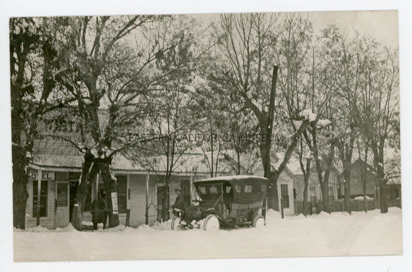 Photo postcard of a snowy street scene in Lone Pine. The Anton Hotel (Whitney Hotel?) is on the left with an early vehicle parked in front. There are two people standing outside. One of the trees in front of the hotel has a large poster affixed to it.Photograph Details