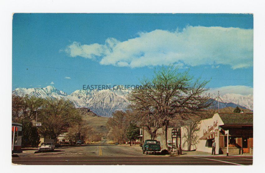 Color photo postcard of a street scene looking toward the snow covered Sierra Nevada. A store on the right corner appears to be a Trading Post. Label on reverse says, "Lone Pine, Sierra Nevada: Lone Pine was named after a tall Jeffrey pine that stood along Lone Pine Creek, later washed out in a flood. In 1861 Bart and Alny [Alney] McGee built the first cabin in the valley. The mines of Cerro Gordo, Darwin, and Panamint City brought in a great number of immigrants. For many years Sept. 16, the anniversary of Mexico's liberation, was Lone Pine's day of celebration. Lone Pine Peak is 12,944 feet high with Mt. Whitney the highest (14,495 ft.). There are six peaks in the area over 14,000 ft. high. In 1872 an earthquake caused the land to drop 20 feet and took the lives of 26 people. At one time Mt. Whitney was named Fisherman's Peak. The first trail was built to the top of Mt. Whitney in 1881 and 20 years later people of Lone Pine raised the money to build a better trail to the top." Photo-color by Merle Porter. B-977. S-71919.Photograph Details