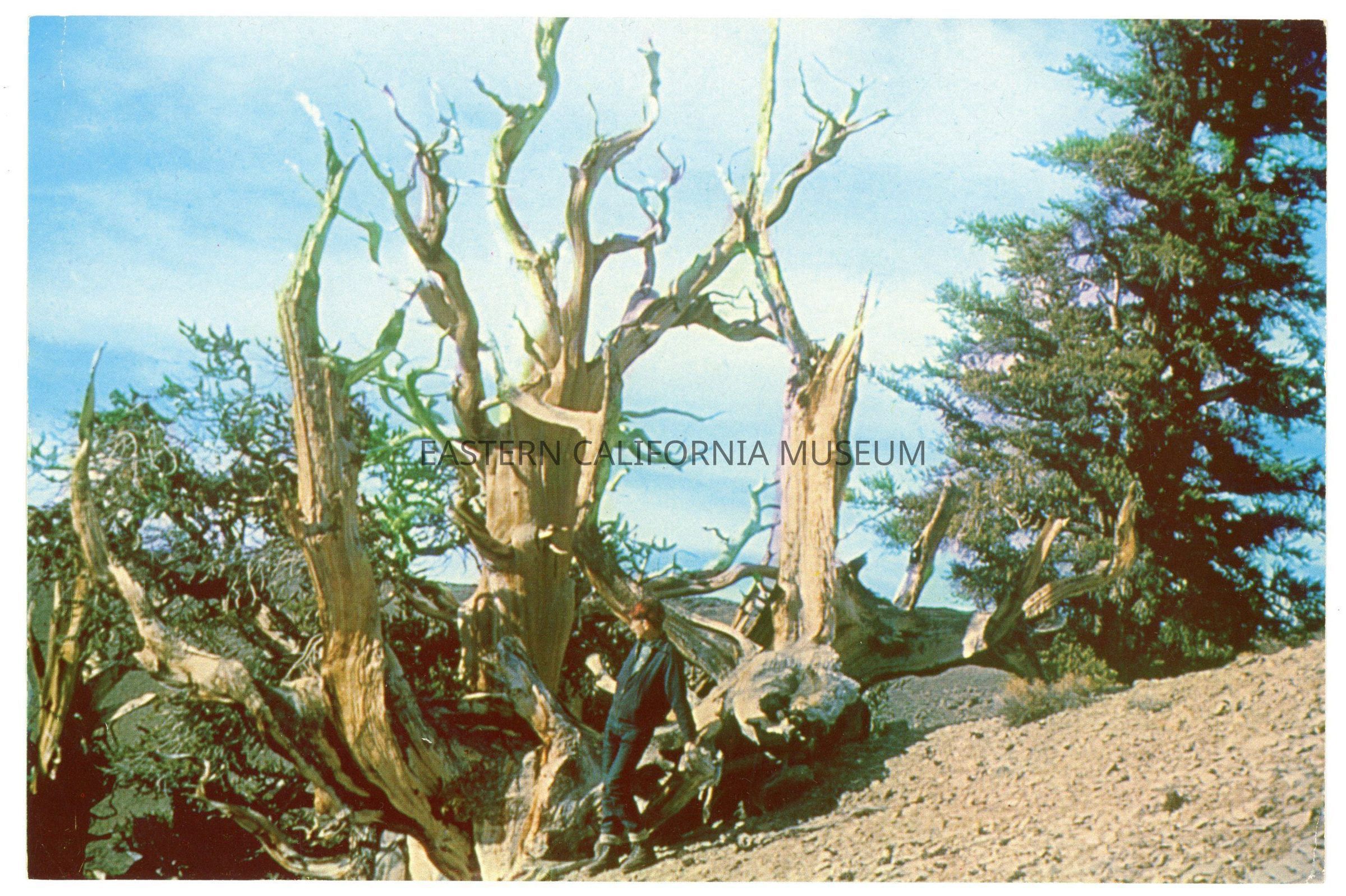Oversized color photo postcard of a person standing at the base of a bristlecone pine tree. It is published by Columbia and given their ID #J-1025 and #55277.Photograph Details