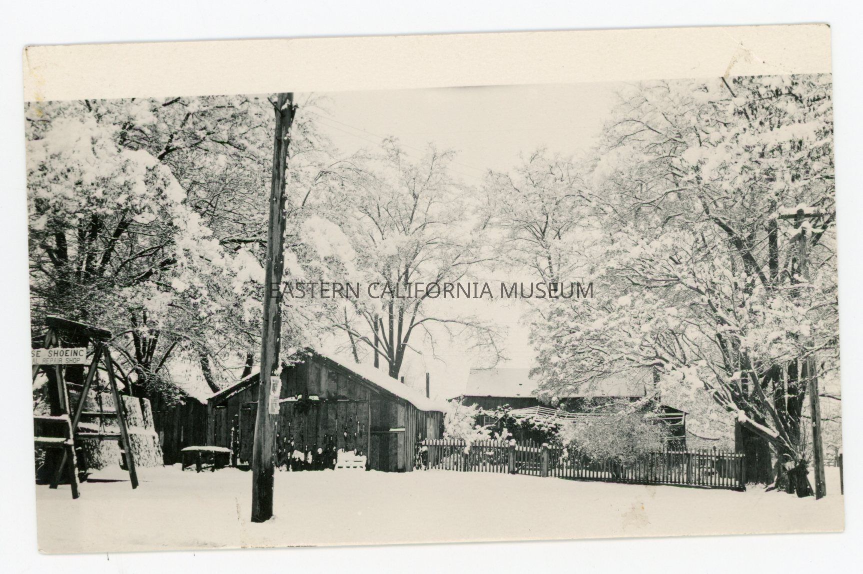 Photo postcard of a snowy street scene. There is a sign advertising horse shoeing on the far left side, a pole with a poster in the left center, and a fenced-in house in the background. Location is likely Lone Pine.Collection