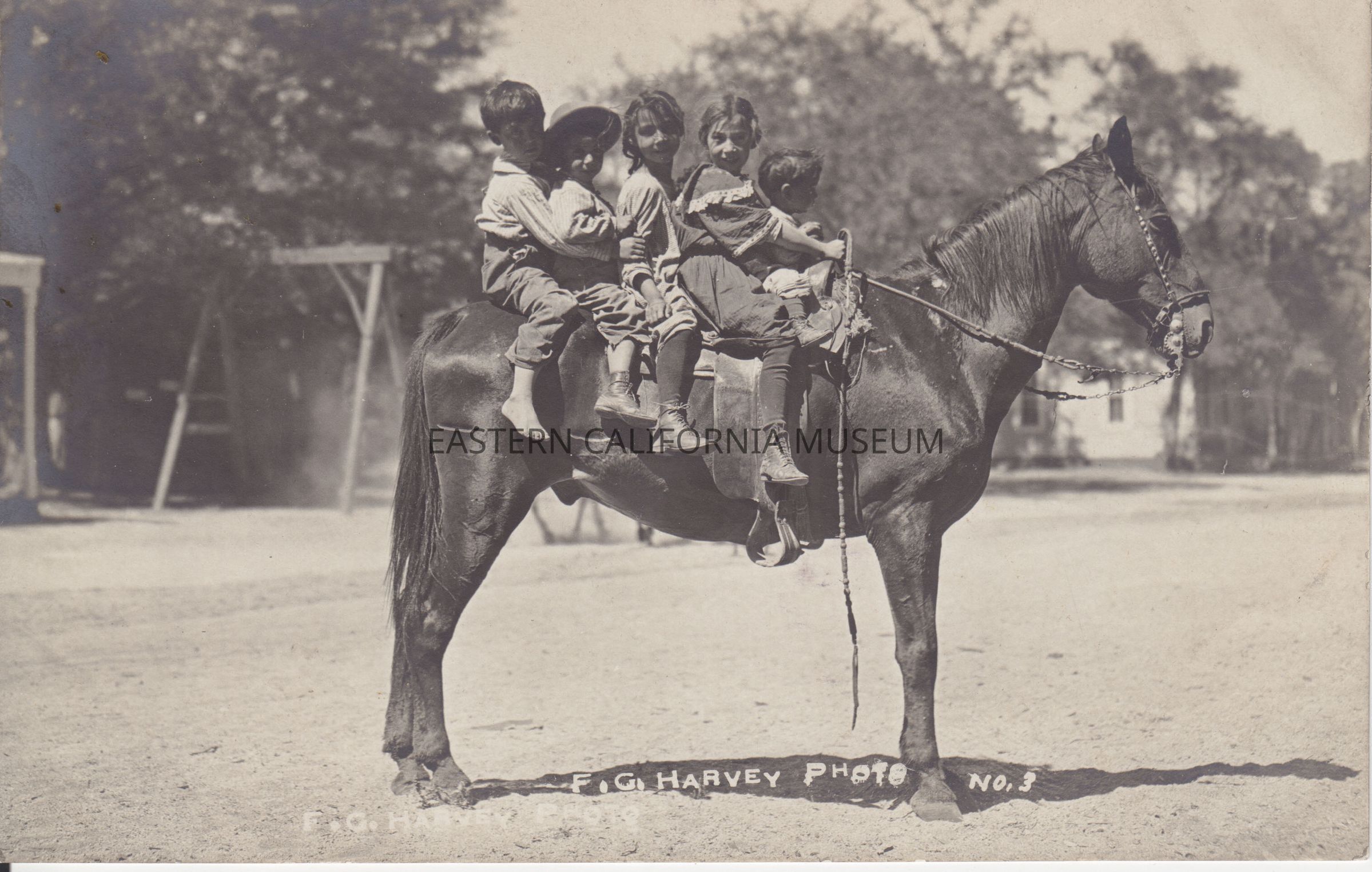 Photo postcard of five children on a horse. It was taken by photographer F. G. Harvey and given his ID #3. The location is likely Lone Pine.Collection