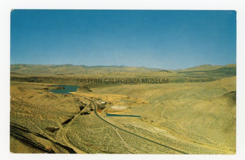 Color photo postcard of Little Lake and Highway 395 taken from a high vantage point or aerial shot. Label on reverse says, "Little Lake, California. Little Lake is a small settlement located on highway 6-395 at the lower end of the Alabama Hills. The place was named for a 10-acre, privately owned lake that gleams beside the road. Today the settlement is a stopping place for those who travel north to the High Sierra Country and those who go east into Death Valley." Photo-color by Merle Porter. B169. S2932Photograph Details