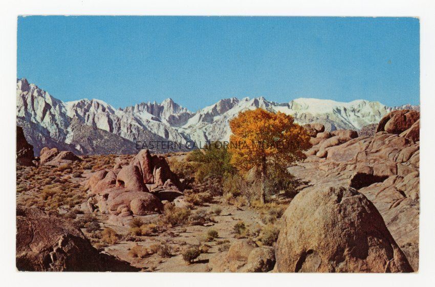 Color photo postcard of the snow-covered Sierra Nevada with Alabama Hills in the foreground. There is a tree with colorful orange-yellow leaves in the center. Label on the reverse says, "Mt. Whitney, the sharp peak seen here at the left of the golden tree, is the highest peak in the lofty Sierra Nevada Mountain Range. It stands at 14,496 ft. Mt. Whitney and the Alabama Hills, in the foreground, are among the top attractions near Lone Pine, Calif." Mike Roberts of Berkley, was likely the photographer. C31013Collection