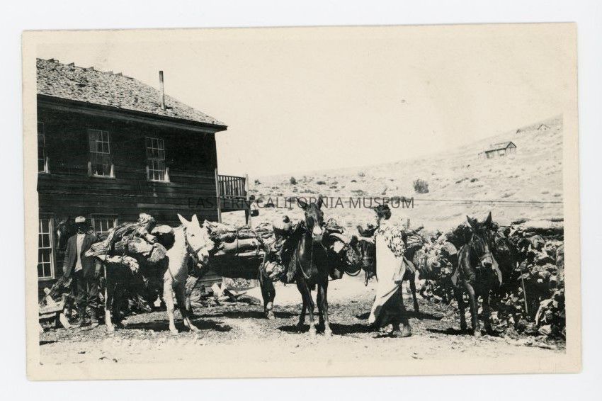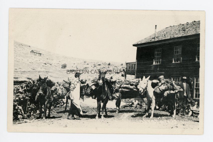 Photo postcard of four mules loaded with wood at Cerro Gordo. The two story building behind them is the American Hotel. There are two people standing with the mules, maybe the mule driver and the cook (wearing an apron)?
