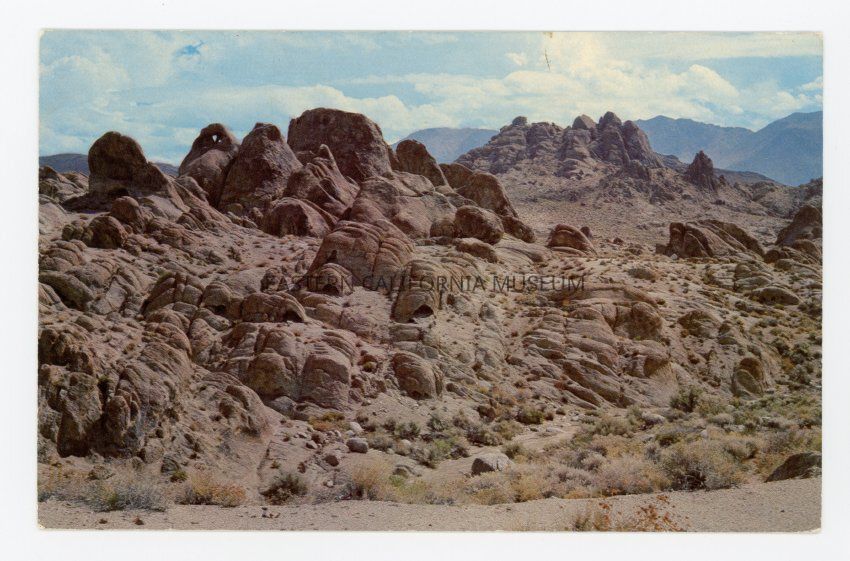 Color photo postcard of the Alabama Hills. Label on the back says, "The Alabama Hills two miles west of Lone Pine, Calif., are massive rock formations of unusual beauty. They provide the locale for many western motion pictures and television shows. The scenic quality of the Alabama Hills is heightened by their location at the base of the High Sierra. Color by Mike Roberts for Chris Cards of China Lake. Another Chris Card. C26888Photograph Details