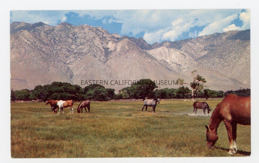 Color photo postcard of a pasture with several horses and mountains in the background. Label on back says, "These peacefully grazing horses in pastures flanking the town of Olancha, Calif., typify the easy-going western life of the community. On U.S. Highways 6 and 395, Olancha is one of the favorite entryways into the fishing, hunting, and camping areas of the High Sierra and at the same time is one of the gateways to Death Valley." Another Chris Card. P26680Collection