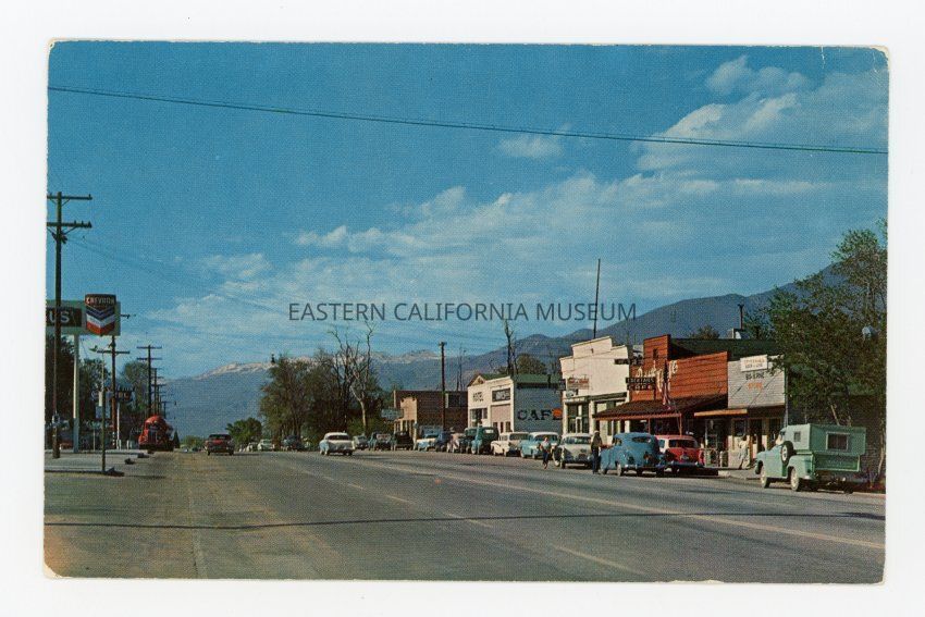 Color photo postcard of Big Pine Main Street. Chevron gas station on left, stores, restaurants, cafes, and hotels visible to the right. Many cars parallel parked in front of these stores. Label on reverse says, "Big Pine, California. Big Pine is located on Highway 395 on Big Pine Creek, at an elevation of 4,002 ft. This quiet little village is shaded by great oaks and maple trees. Catering to motorists and the outfitting of fishing, packing, and hunting parties bound for the high Sierra constitute its chief sources of income. Photo-color by Merle Porter. B-512. S23426Photograph Details