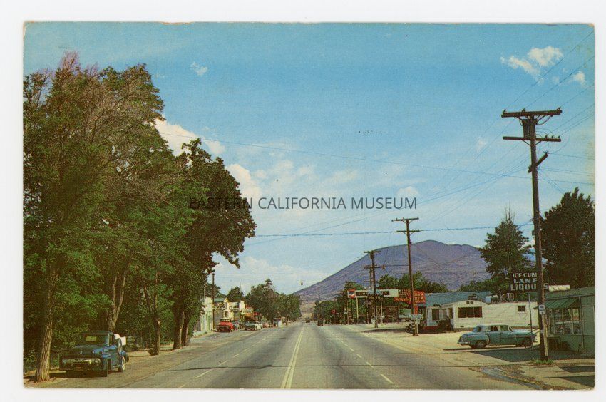 Color photo postcard of Big Pine Main Street taken from the north end of town looking south towards Crater Mountain. Businesses visible include Lane Liquors, Jim [illegible] Motel, and Chevron gas station. Label on reverse says, "Big Pine, California. On Highway 6 and 395 this is an outfitting point for trips into the High Sierra. The famous Westgard Pass to Goldfield is east of here. Palisade Glacier is 18 miles west." Color by Jim Horn. H-2936. 47802Photograph Details