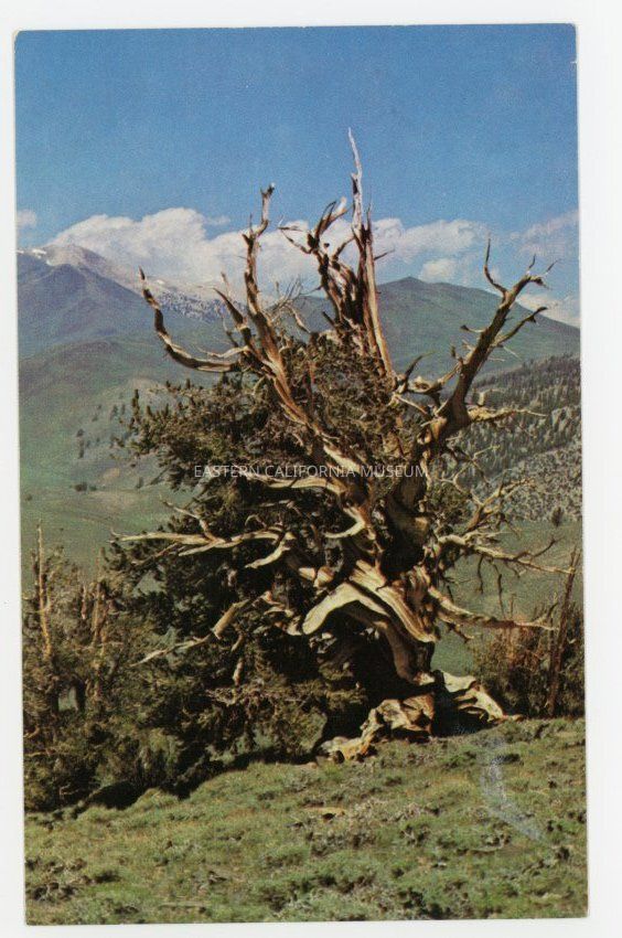 Color photo postcard of a bristlecone pine tree. Label on reverse says, "Ancient Bristlecone Pine Forest, Inyo National Forest, California. A twisted giant of past and present, this living tree numbers its age in thousands of years. The Bristlecone pine are one of the oldest living things on earth." Photo by High Country Cards. Distributed by Kelsey's Sierra Studios in Bishop. 011083Photograph Details