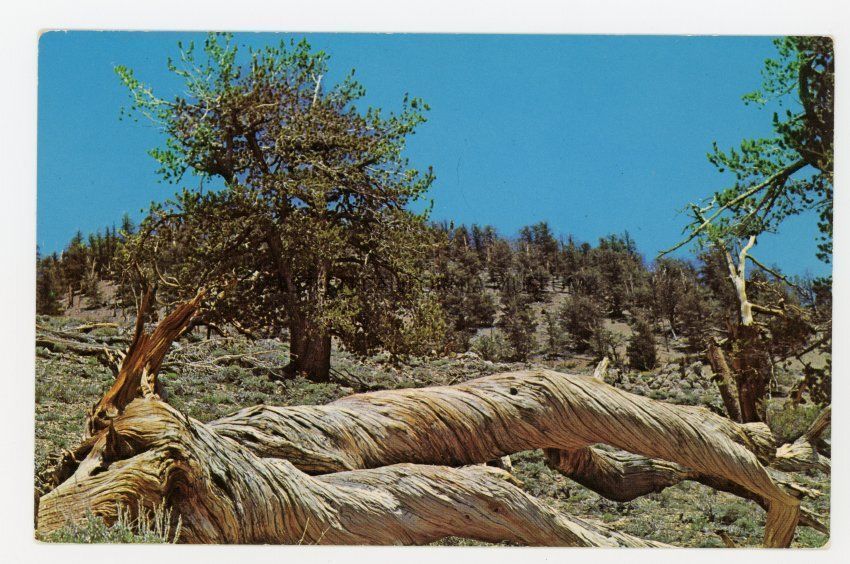 Color photo postcard of bristlecone pine trees on a hill. Label on reverse says, "Ancient Bristlecone Pine Trees were growing in the White Mountains of California before Moses received the Ten Commandments and are still alive and growing, after 4,600 years, of severe temperature and terrain. The elements have distorted these trees into a living driftwood effect. During prolonged dry spells the tree has the ability to live within itself. Sometimes adding less than an inch of growth in 100 years." Color photo by Louis and Virginia Kay. H-3182Photograph Details