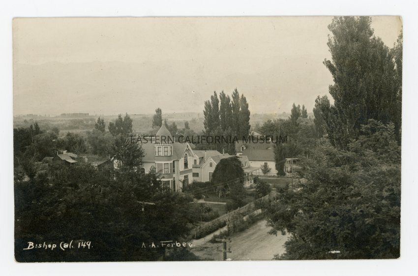 Photo postcard of the Dr. Dorrance home in Bishop, CA. It was taken by photographer A. A. Forbes and given his ID #149. It was taken from a high vantage point (maye the opera house?).