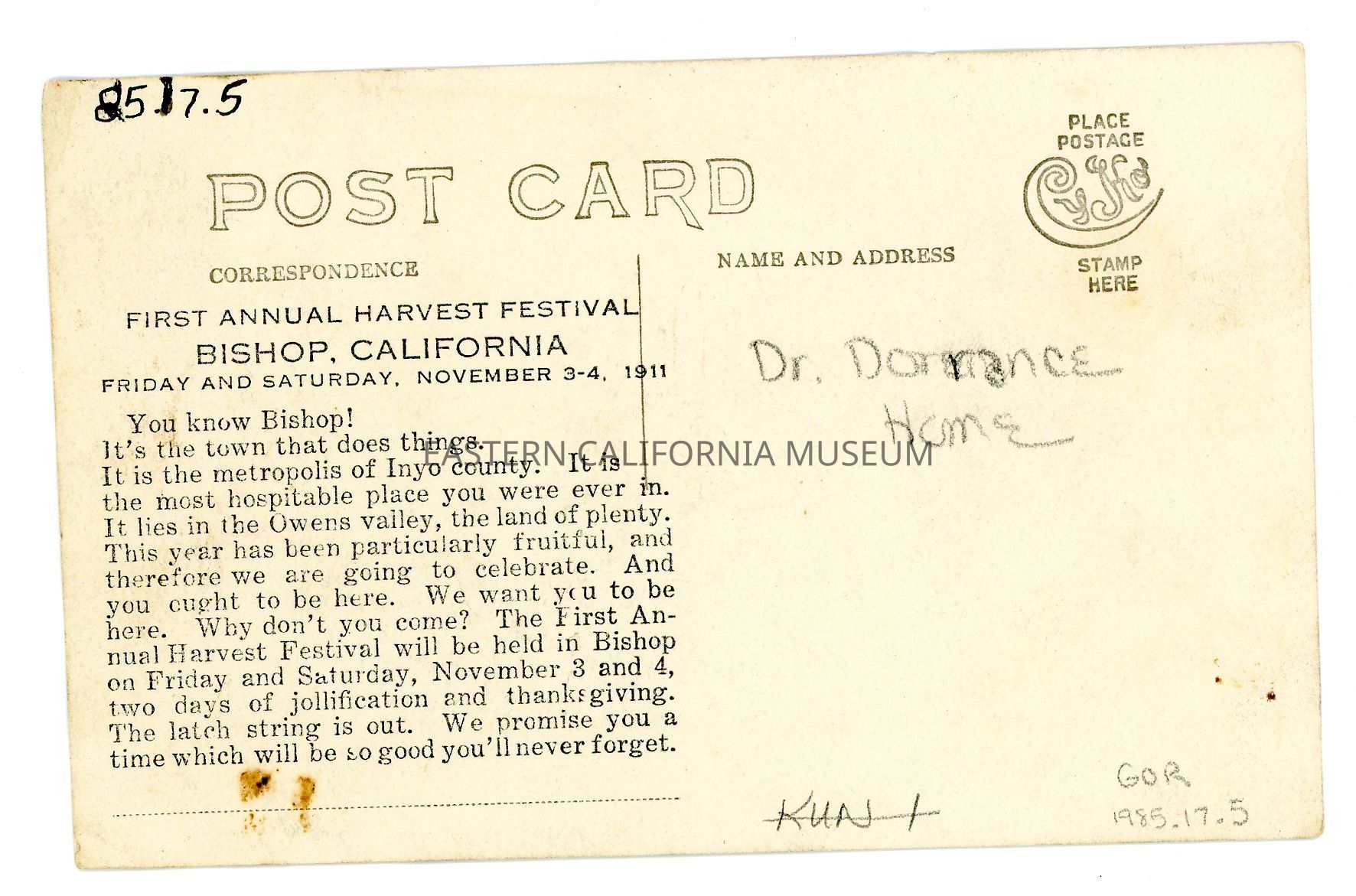The reverse has an invitation to the First Annual Harvest Festival in Bishop to be held on November 3-4, 1911. It reads: "You know Bishop! It's the town that does things. It is the metropolis of Inyo County. It is the most hospitable place you were ever in. It lies in the Owens Valley, the land of plenty. This year has been particularly fruitful, and therefore we are going to celebrate. And you ought to be here. We want you to be here. Why don't you come? The First Annual Harvest Festival will be held in Bishop on Friday and Saturday, November 3 and 4, two days of jollifcation and thanksgiving. The latch string is out. We promise you a time which will be so good you'll never forget."Made/Created