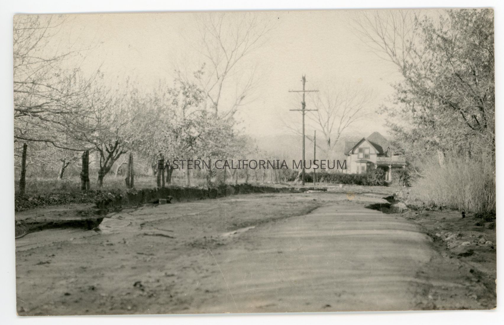 Photo postcard showing flood damage to a street in Big Pine. There is a two story house at the end of the road, an orchard to the left side, and power or telephone poles in the center distance.Photograph Details