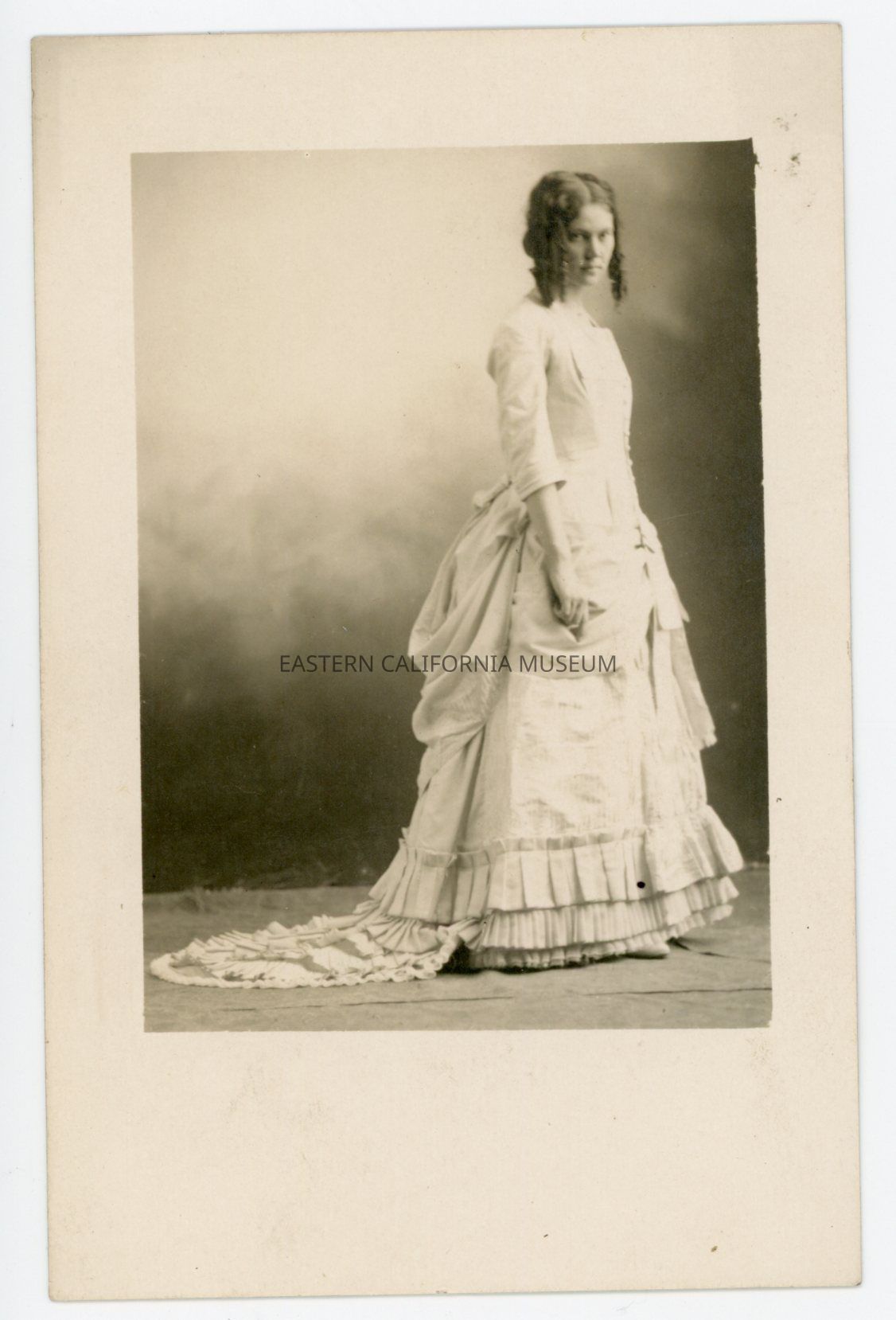 Photo postcard of a woman in a studio wearing a white dress. Her hair is styled in ringlets. In this photo her body is turned away from the camera.Collection