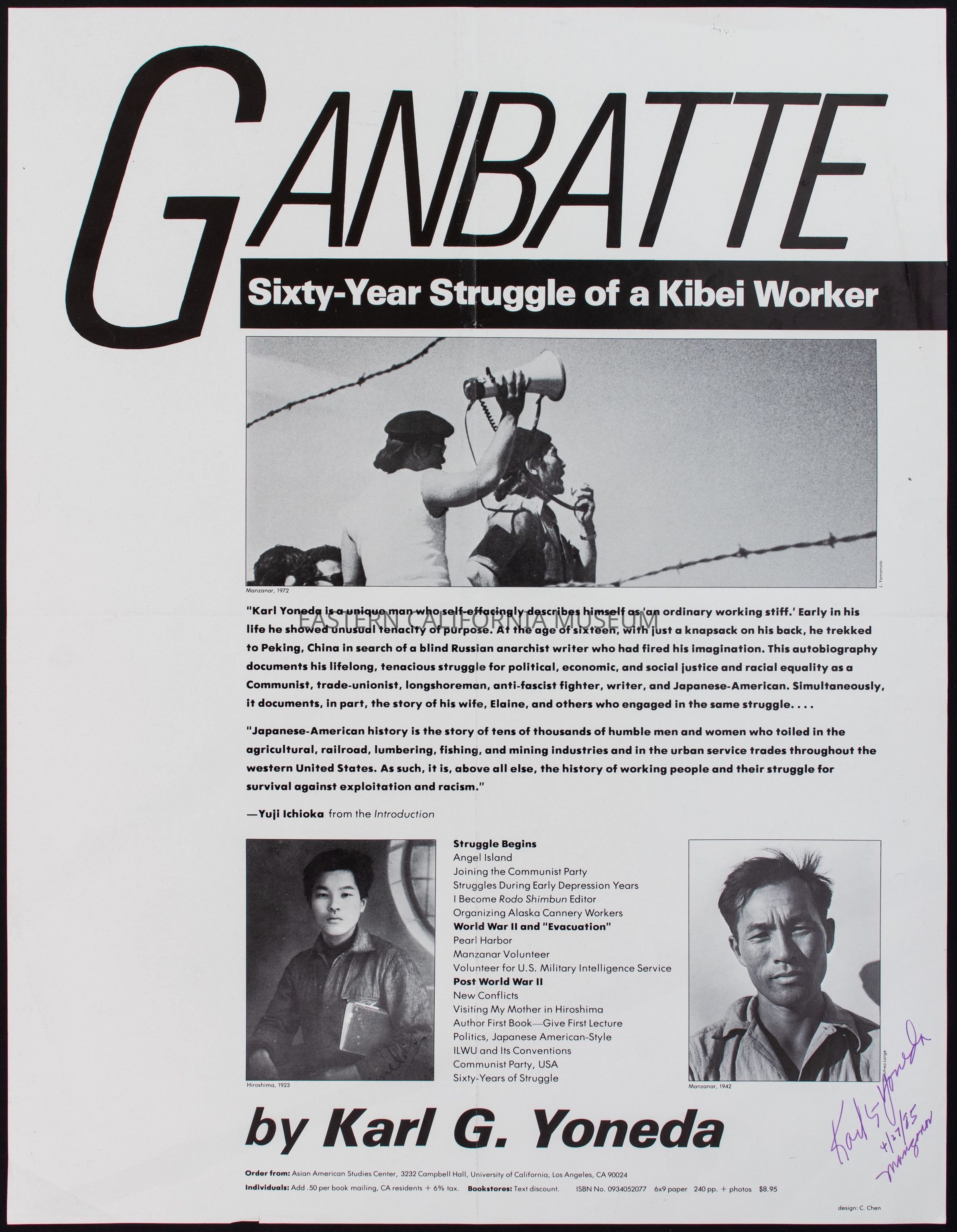 Autographed poster for "Ganbatte: Sixty-Year Struggle of a Kibei Worker" by Karl G. Yoneda.