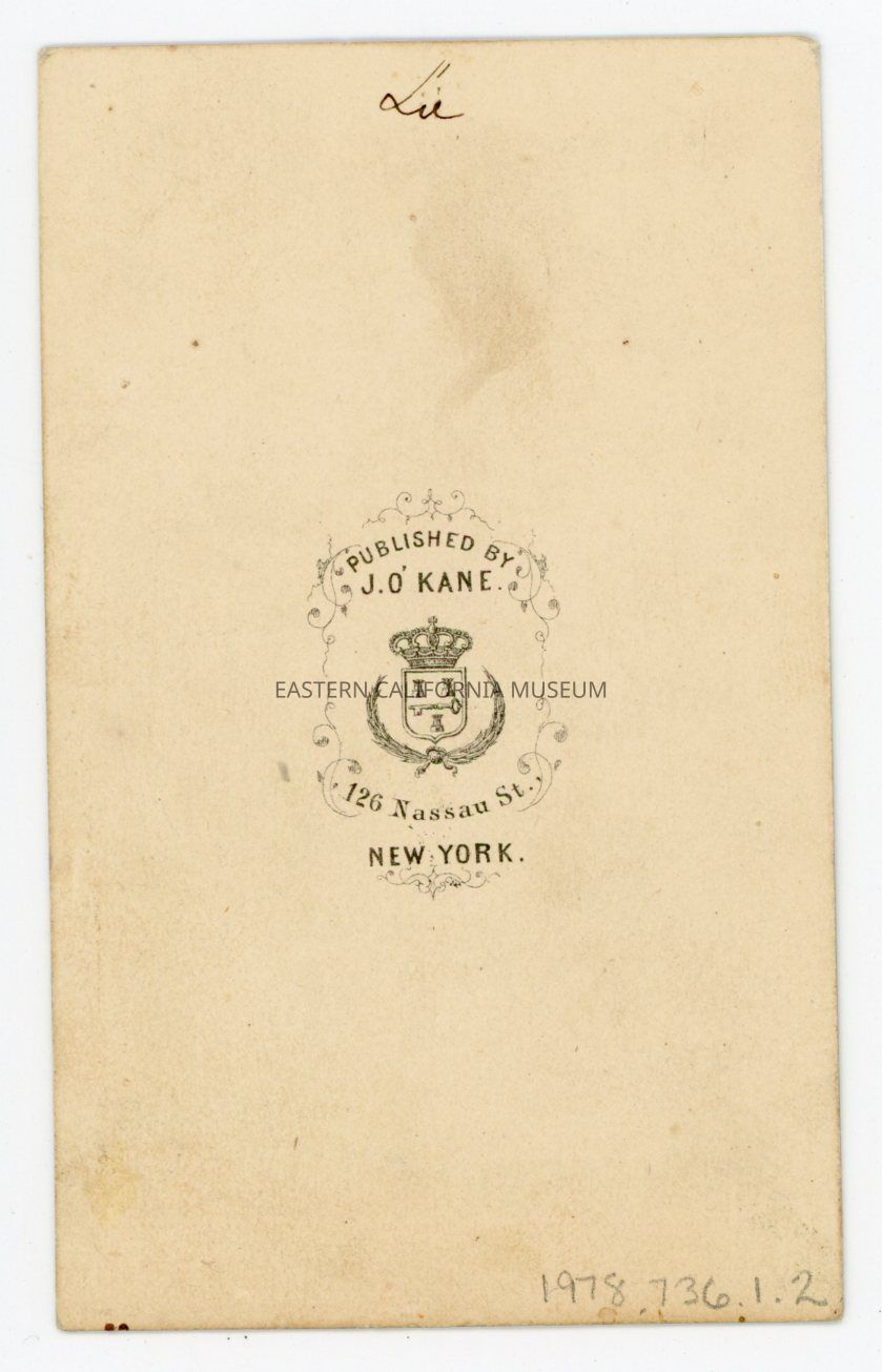 Mounted image of Robert E. Lee wearing a military coat or jacket with epaulets, braid around the collar, and a double row of buttons. Published by J. O'Kane of New York. It was taken circa 1846, prior to the Civil War in which he served as General for the Confederate States Army.