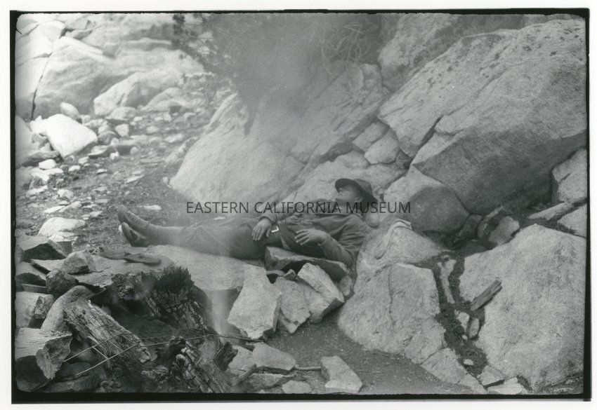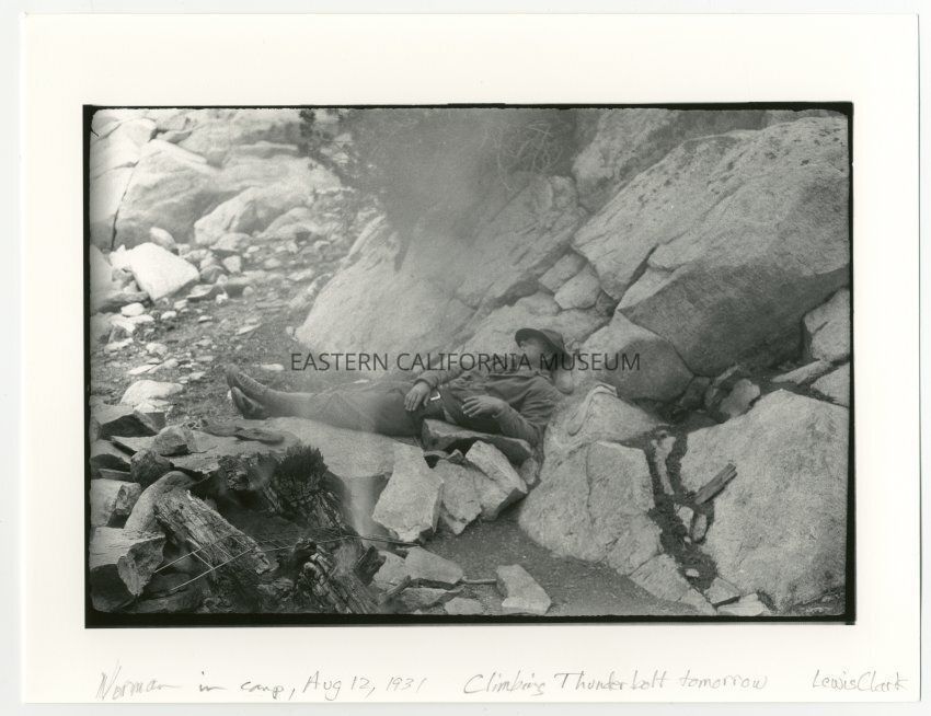 B/W art print on heavy bond paper of Norman Clyde resting or asleep by a campfire the day before climbing Thunderbolt, August 12, 1931. The original photo was taken by Lewis Clark.Collection