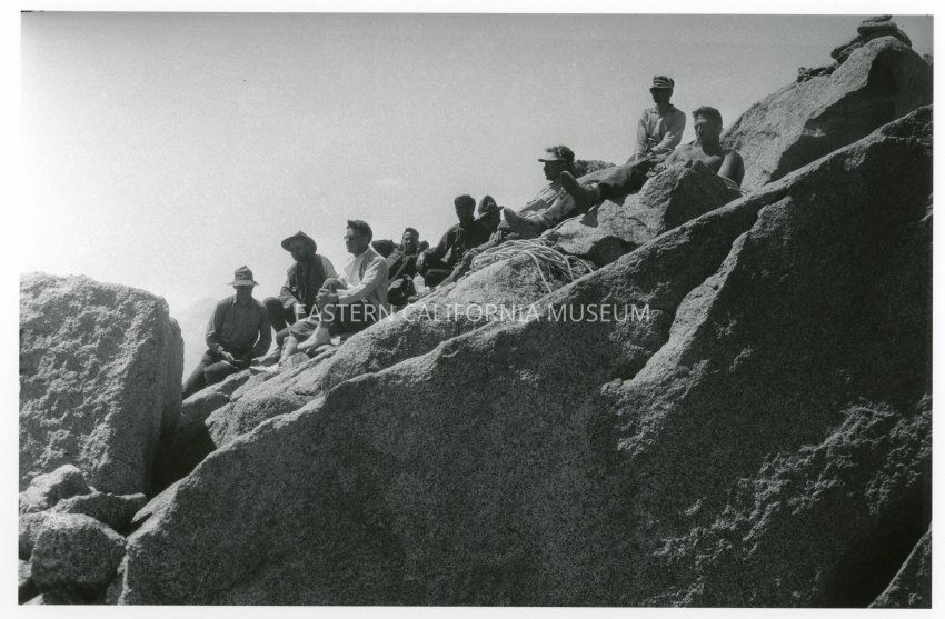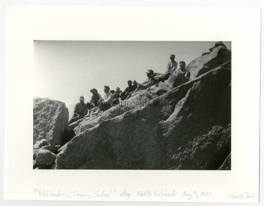 B/W art print on heavy bond paper of "Palisades Climbing School" group on top of North Palisade, August 9, 1931. The original photo was taken by Lewis Clark.