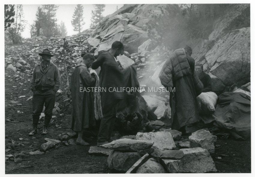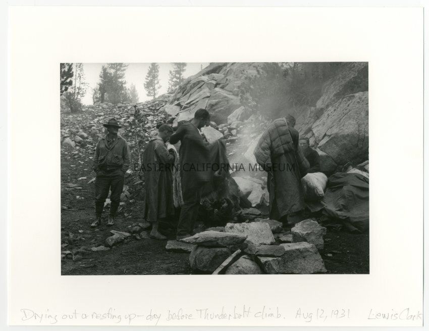 B/W art print on heavy bond paper of Norman Clyde (far left) and group of four other mountaineers bundled up around a campfire. The other men are almost certainly Dawson, Eichorn, Farquhar, and Underhill. The photo is labled, "Drying out and resting up--day before Thunderbolt climb. August 12, 1931." The original photo was taken by Lewis Clark.Collection