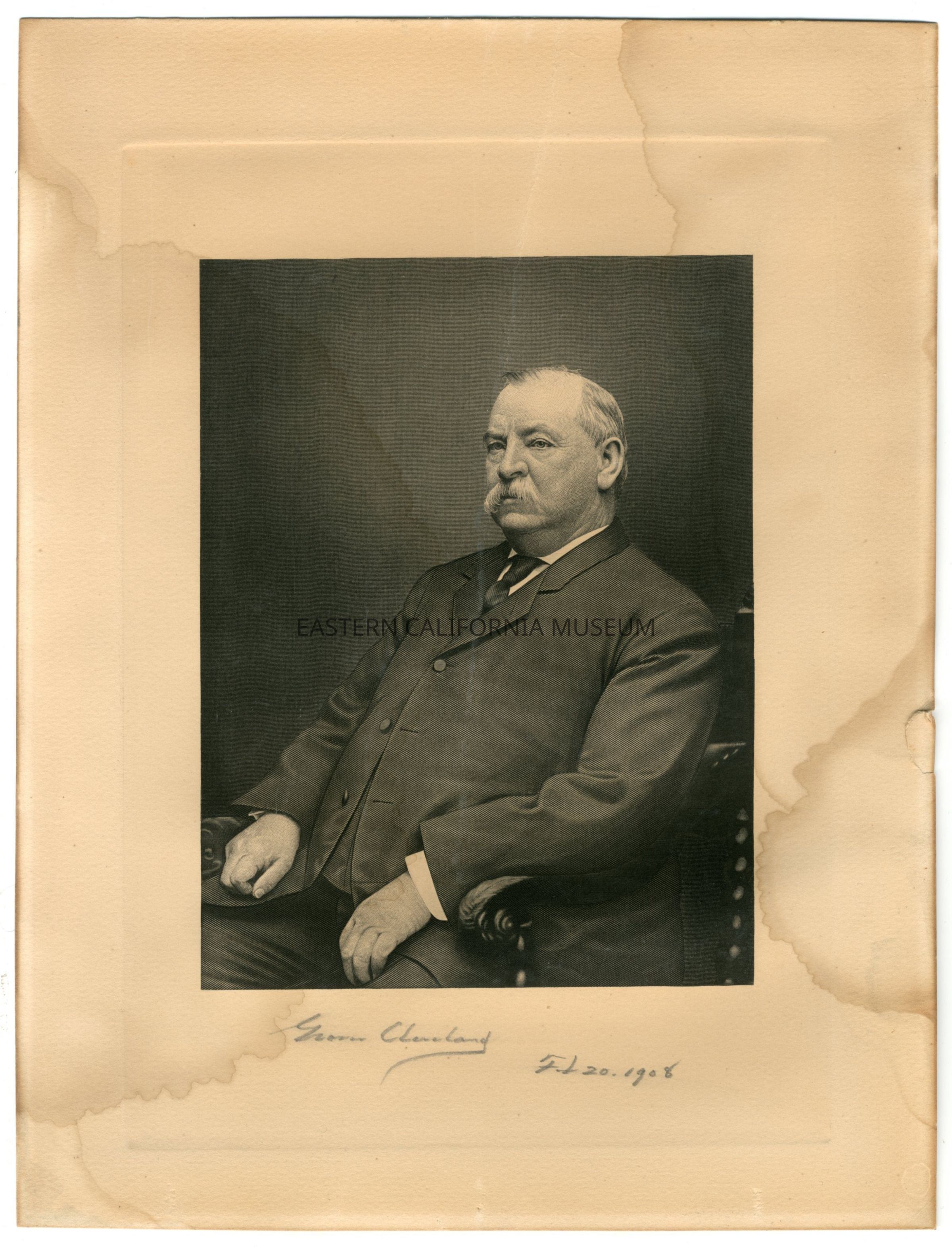 Print of Grover Cleveland seated. It is signed (autographed?) and dated Feb. 20, 1908 in pencil below the image.