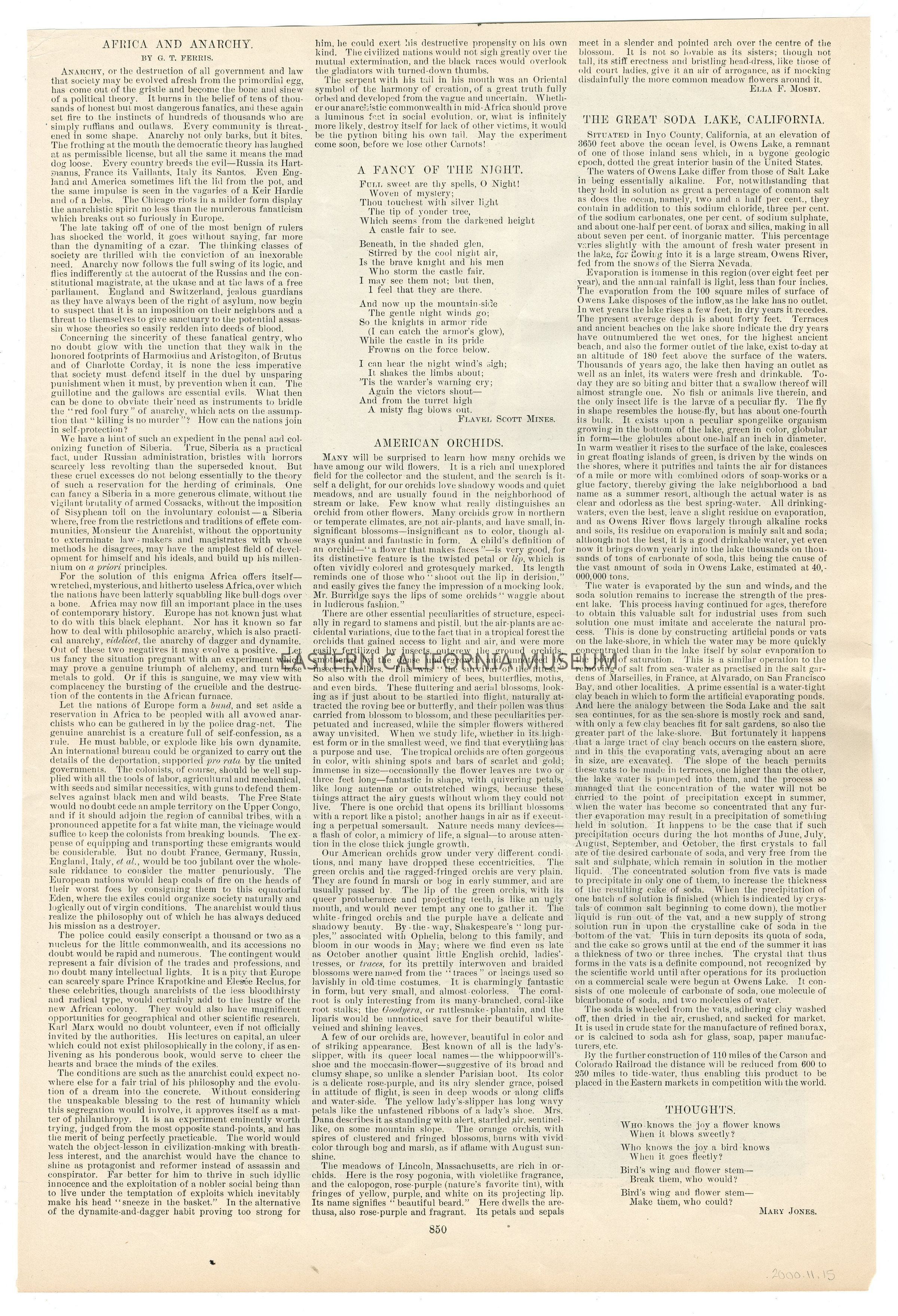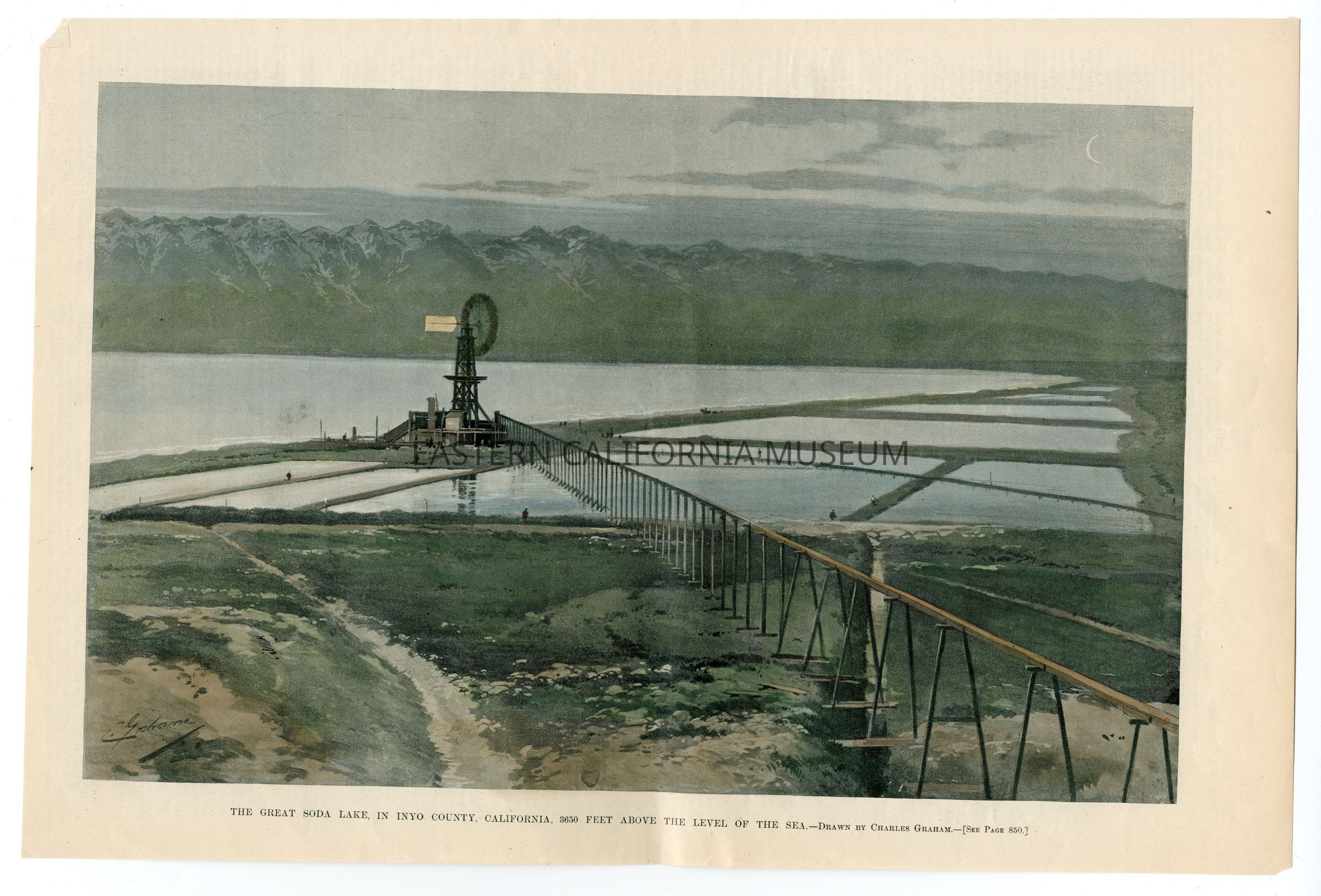 Hand colored lithograph titled “The Great Soda Lake, in Inyo County, California, 3,650 Feet Above the Level of the Sea,” drawn by Charles Graham. Shows a windmill and shallow evaporating ponds/pools. It was published in an 1894 issue of Harper’s Weekly. There is a brief article on the subject on the reverse side.Collection