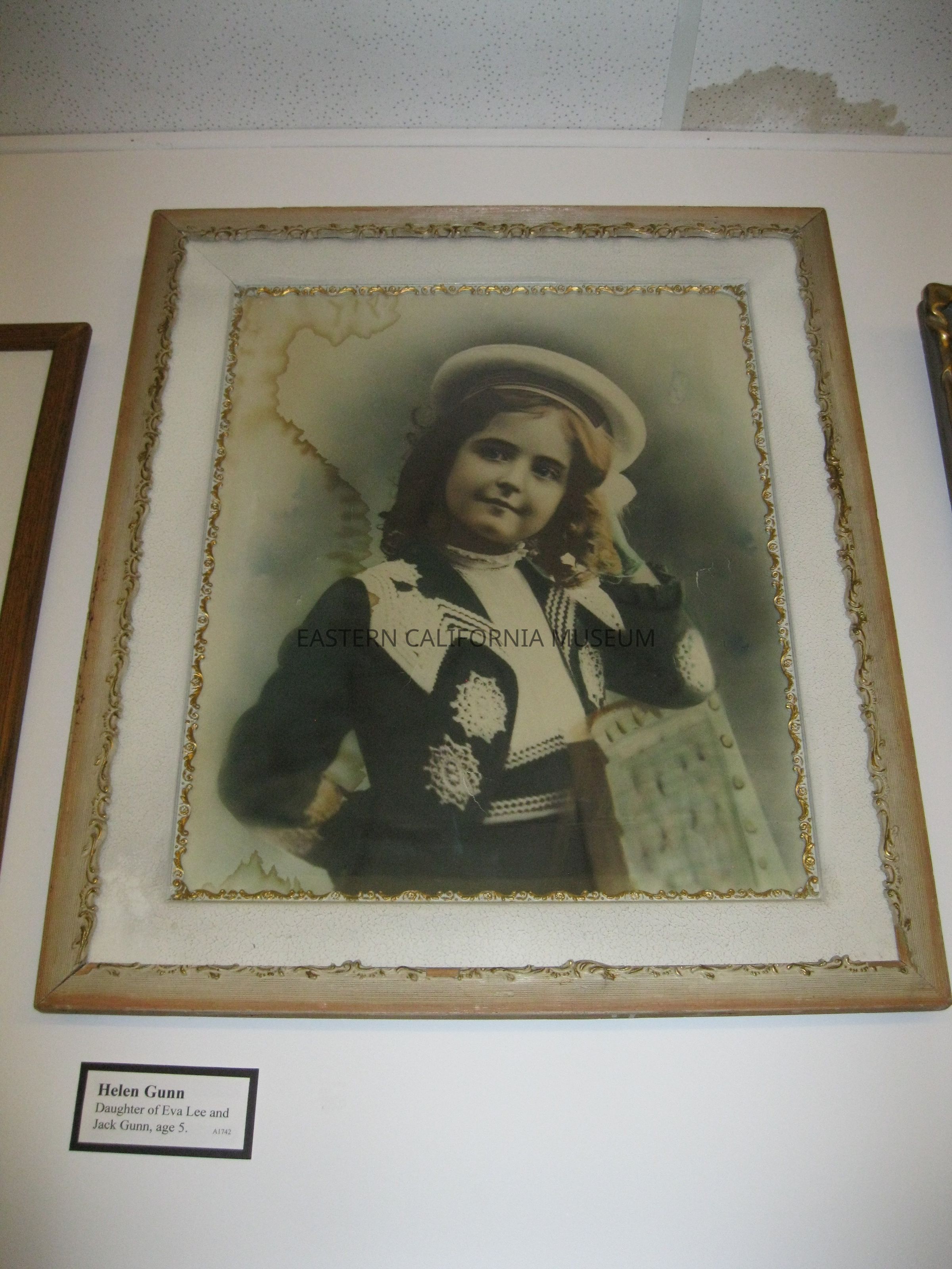 Large framed and tinted photo of Helen Gunn, around 5 years old, wearing a sailor suit and hat. Photograph is water stained but in fair condition.Collection