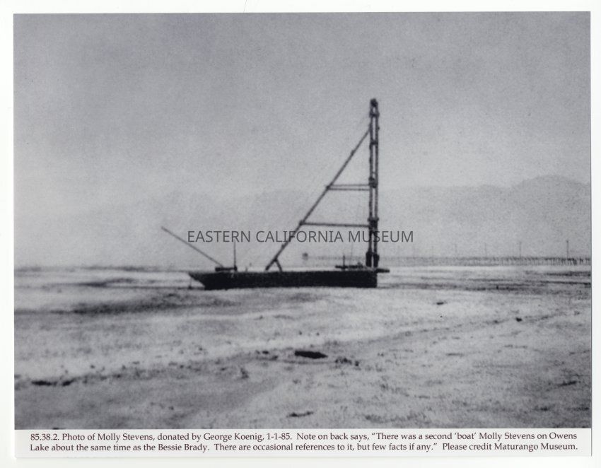 The caption below the photo says: 85.38.2. Photo of Molly Stevens, donated by George Koenig, 01/01/1985. Note on back says, "There was a second boat Molly Stevens on Owens Lake about the same time as the Bessie Brady. There are occasional references to it, but few facts if any." Please credit Maturango Museum.