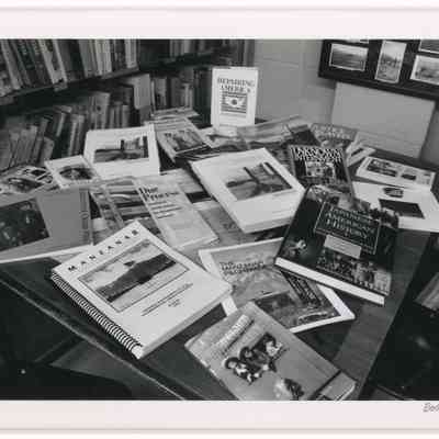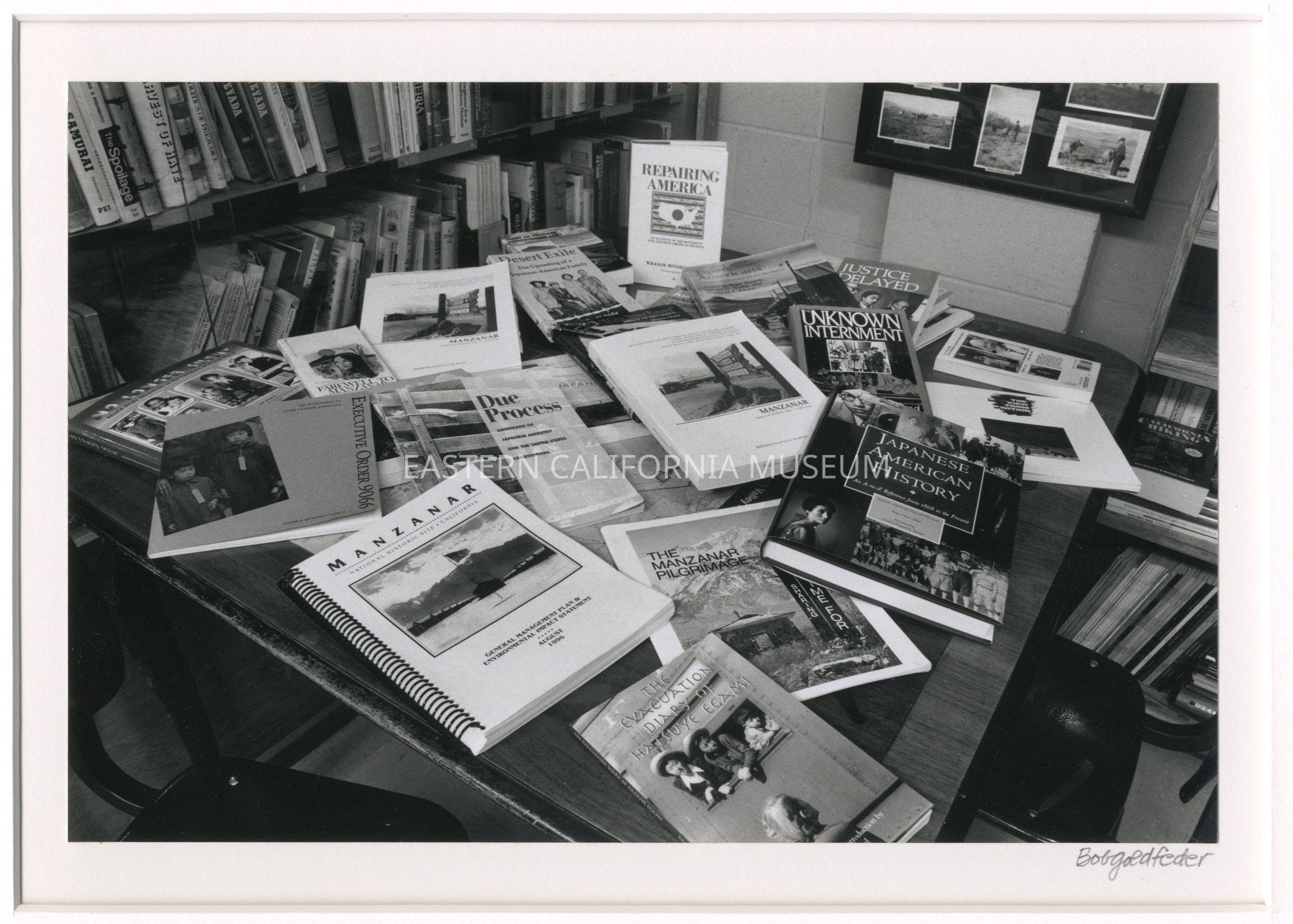 98.23.2--Photo of Manzanar related books on the library table at the Eastern California Museum. Stamped on reverse with donor's information.Photograph Details