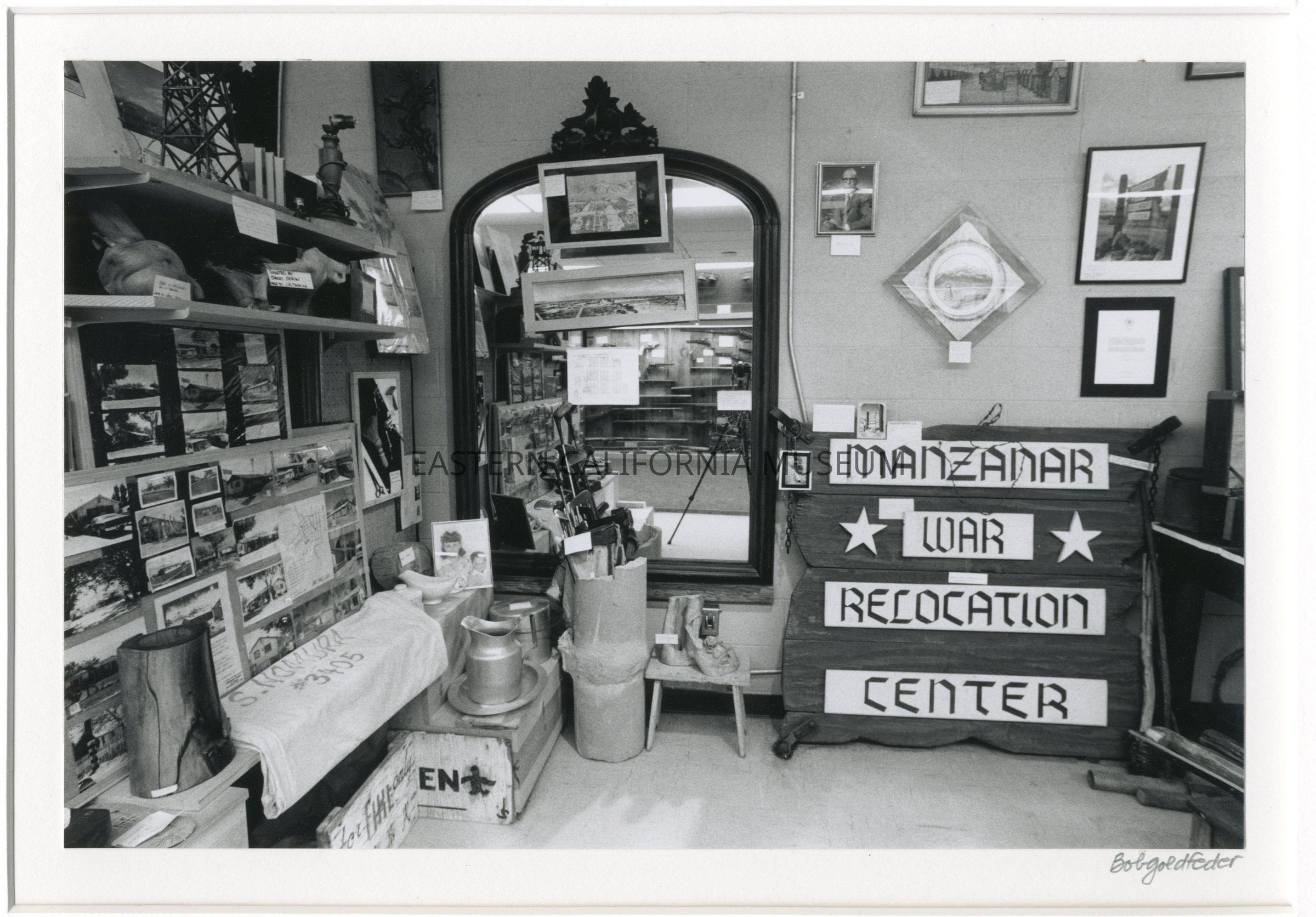 98.23.1--Photo of the Manzanar exhibit area in the the Eastern California Museum. Stamped on reverse with donor's information.