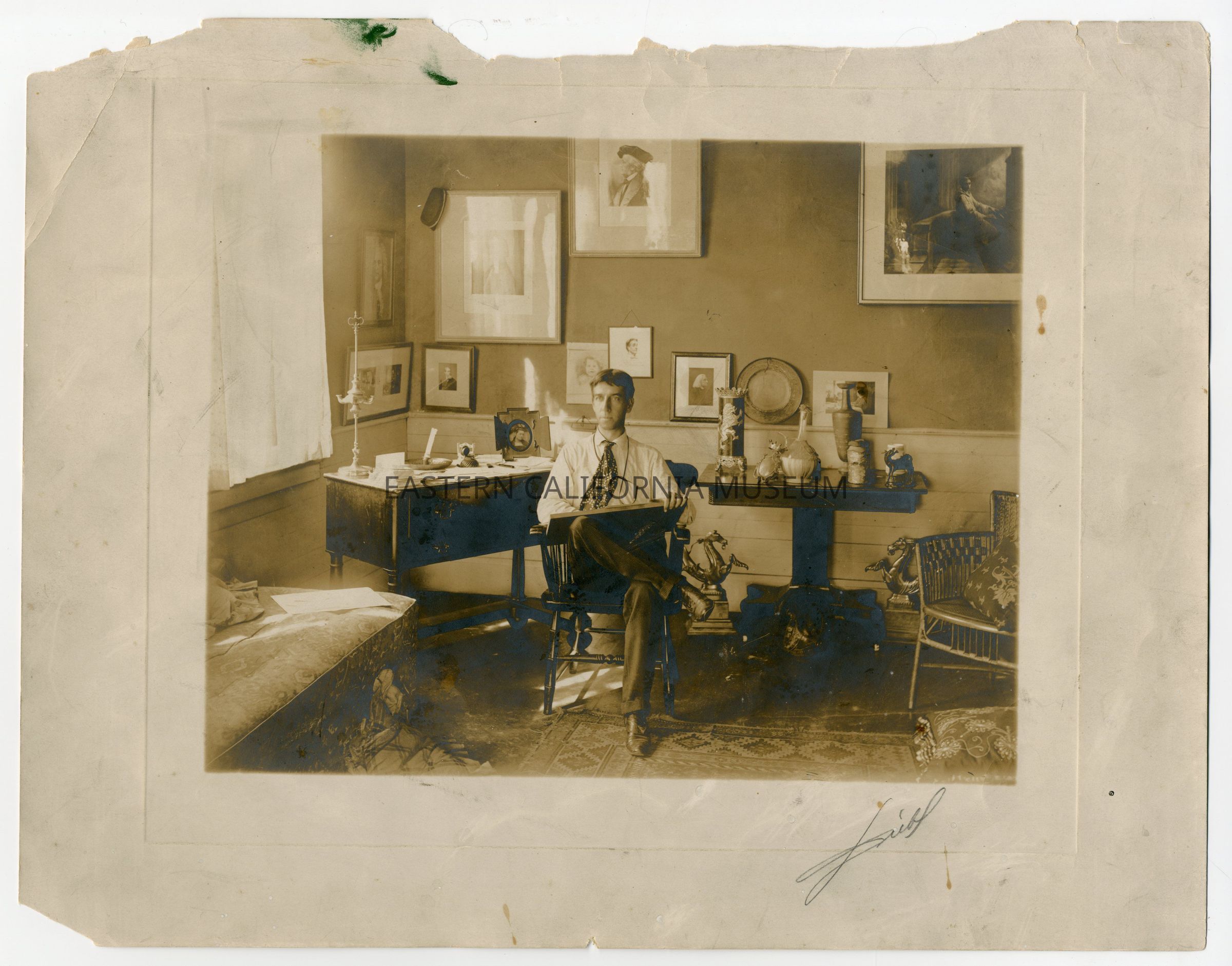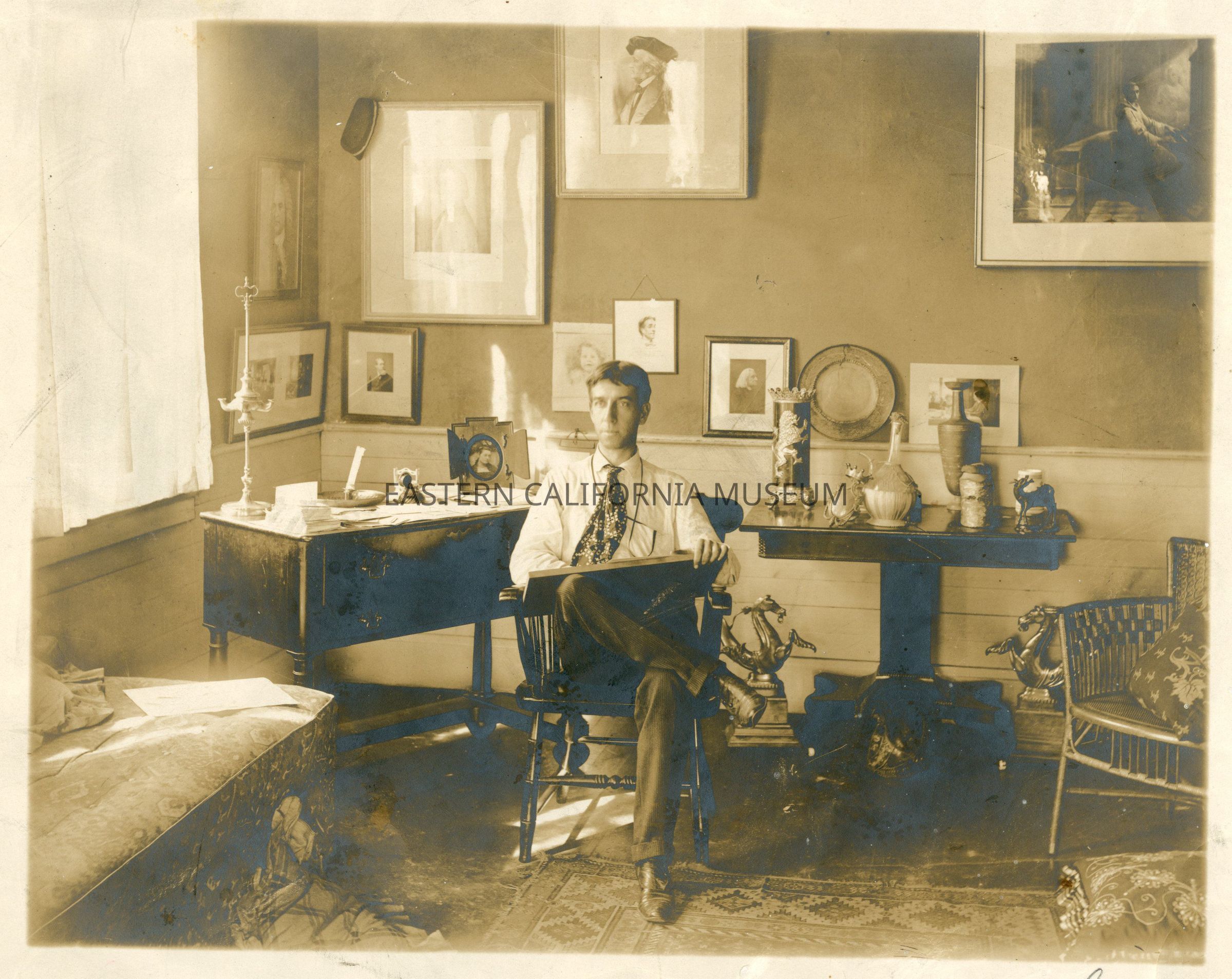 Photograph of Ethelbert Nevin. He was a relation of John L. McCullough through his mother, Mrs. Lazear McCullough. It appears to have been signed in the lower right corner, but the signature is illegible. The photo shows him as a young man sitting in a chair with a tablet in his lap and lots of art on the walls behind him. Mr. Nevin was a famous pianist and composer who died in 1901 at age 38.Collection